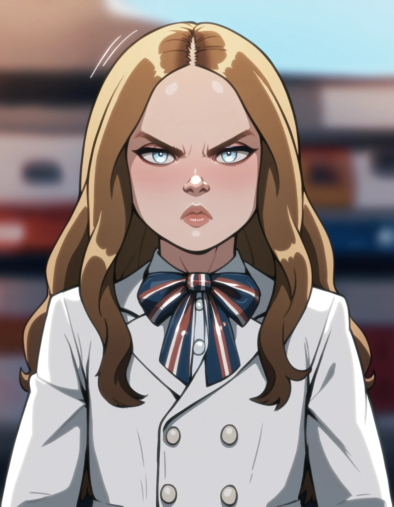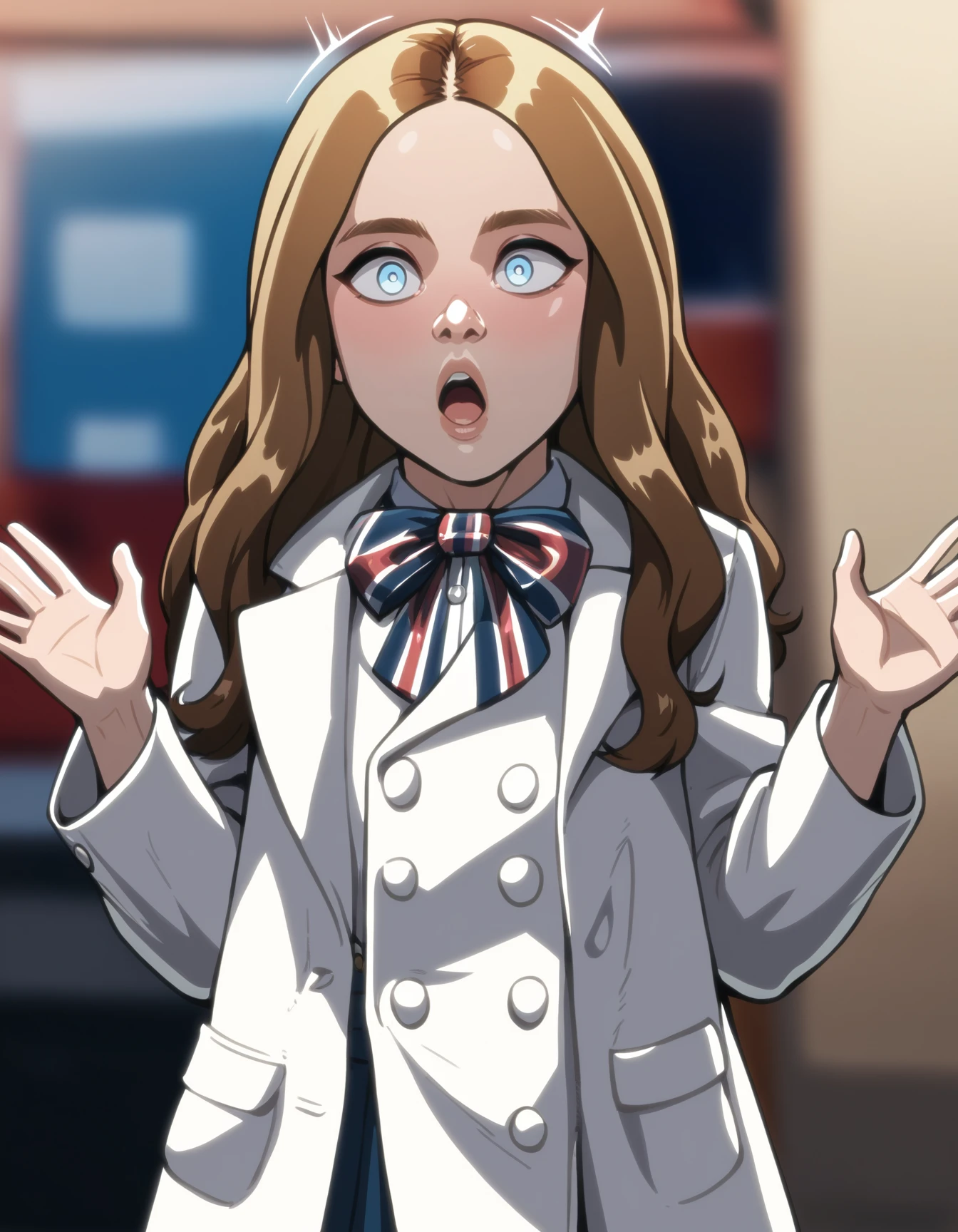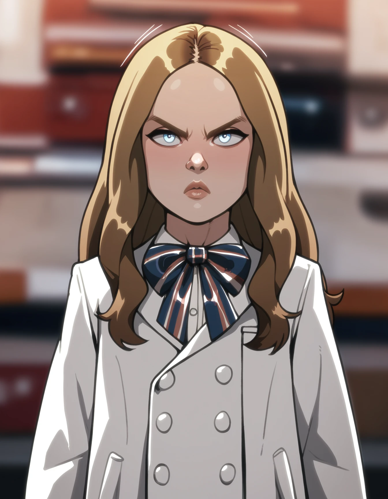 ponpum3gan,1girl,solo, long hair, blue eyes, brown hair,lips,flat chest, long closed white coat,white buttons, bowtie