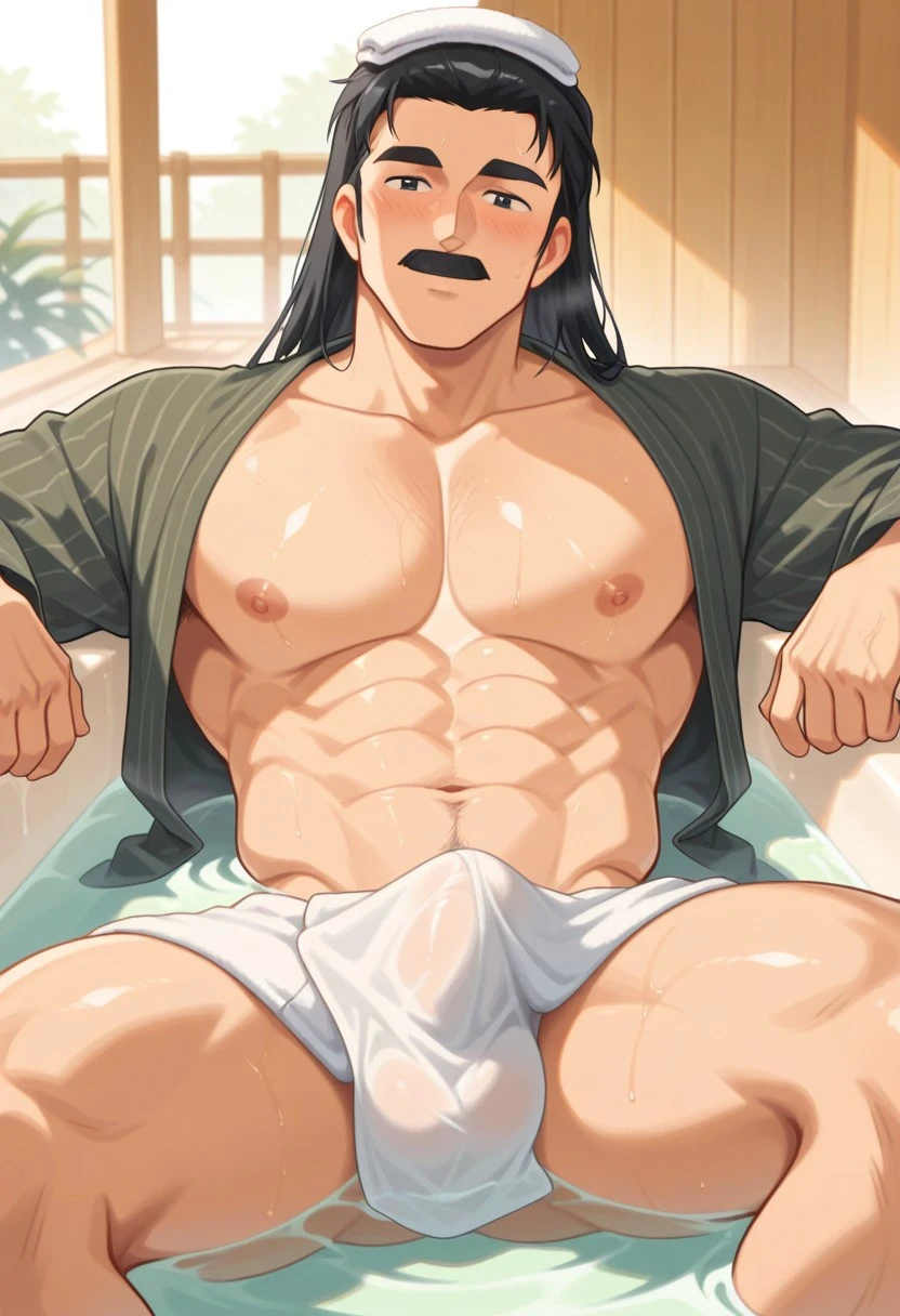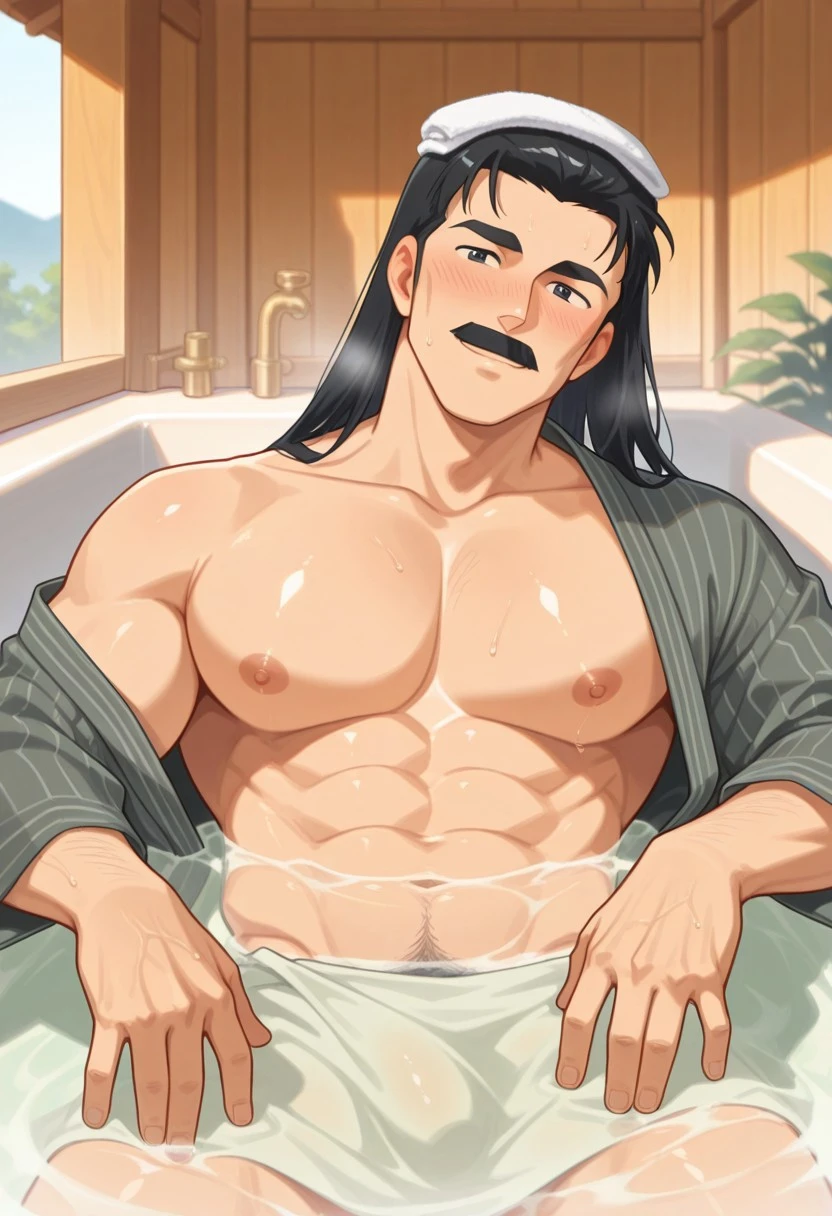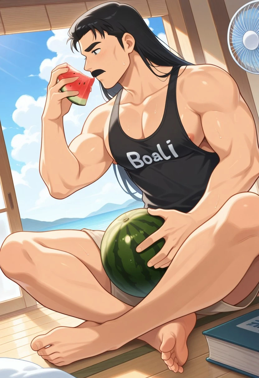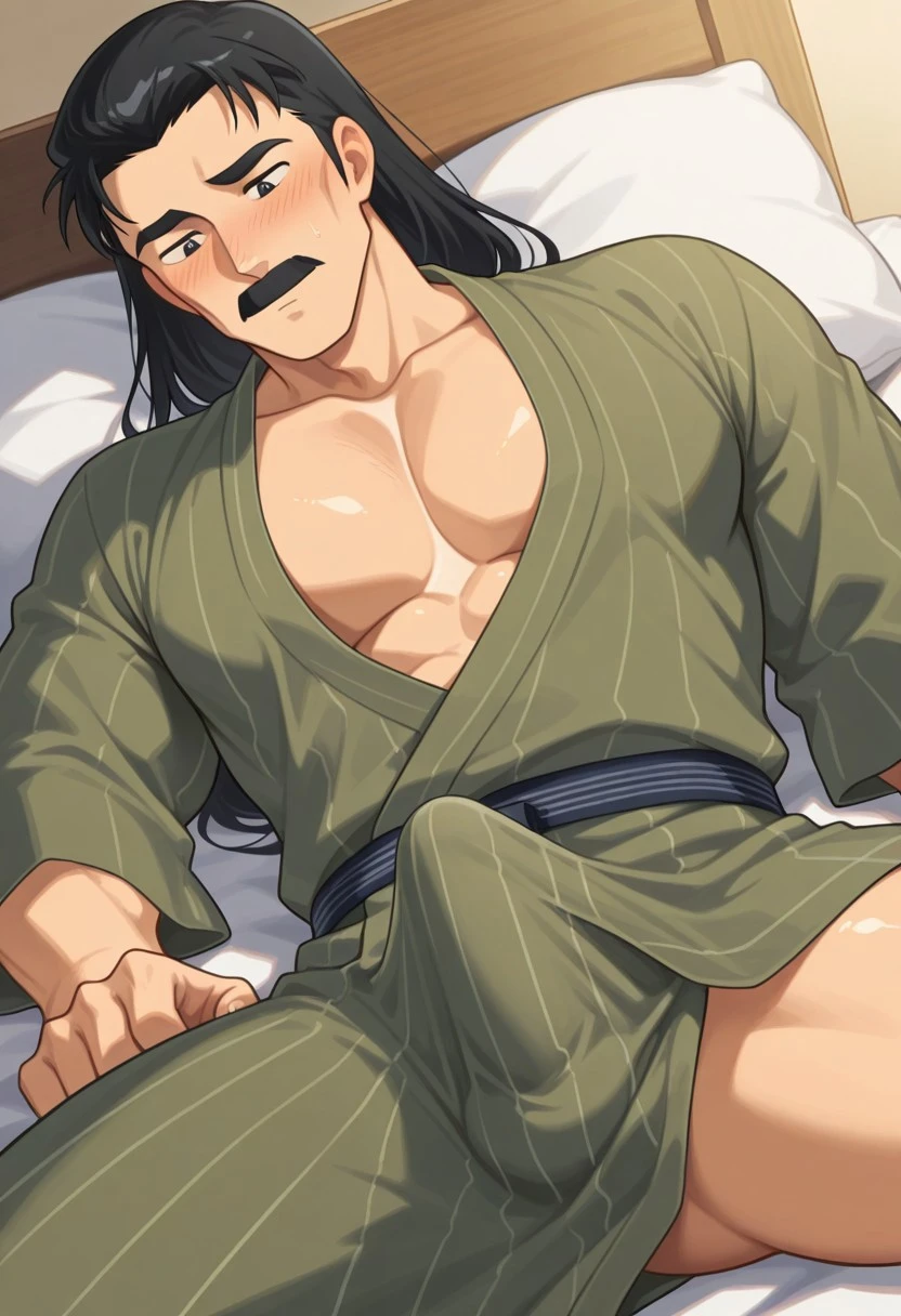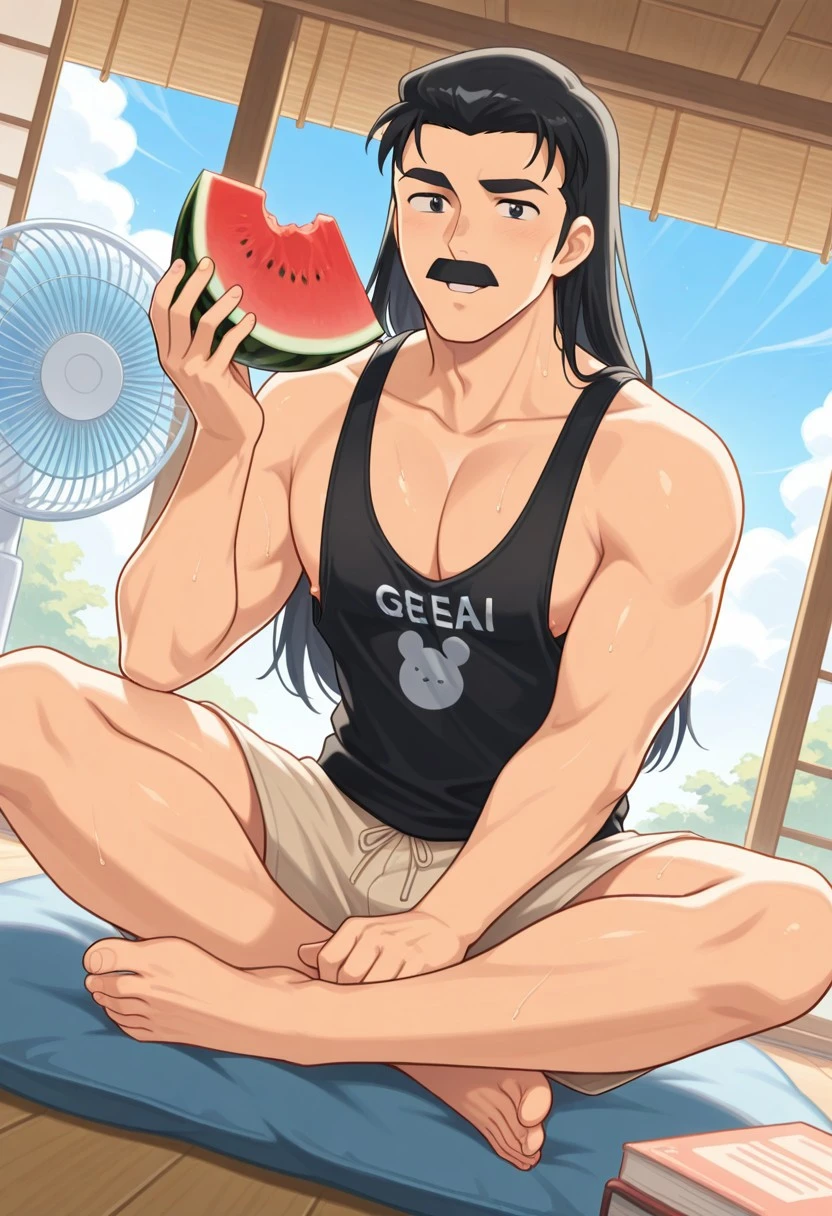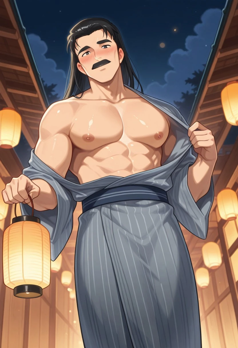 1boy, solo, Soun Tendo, male focus, black eyes, mustache, black hair, long hair, thick eyebrows, black hair