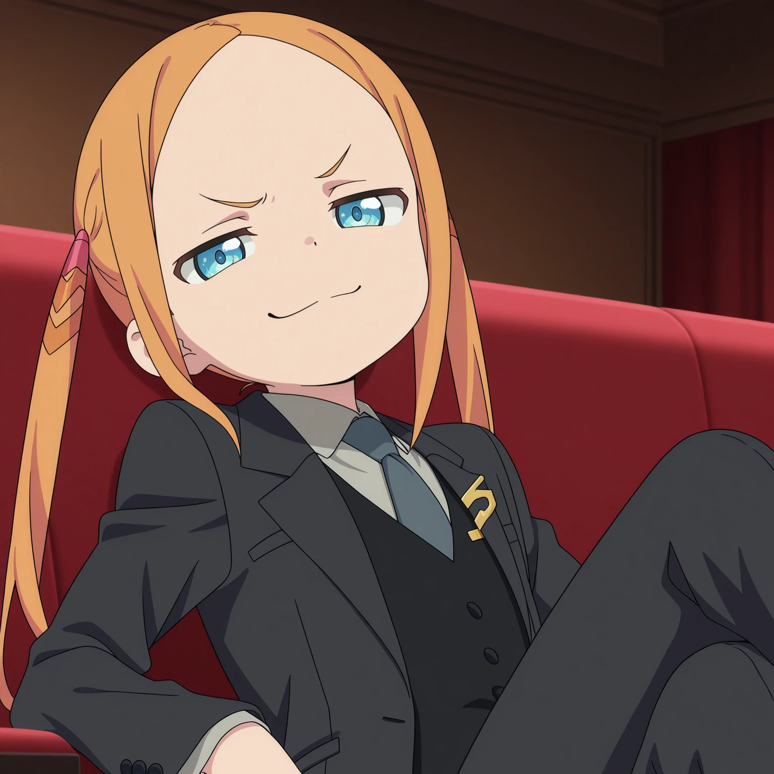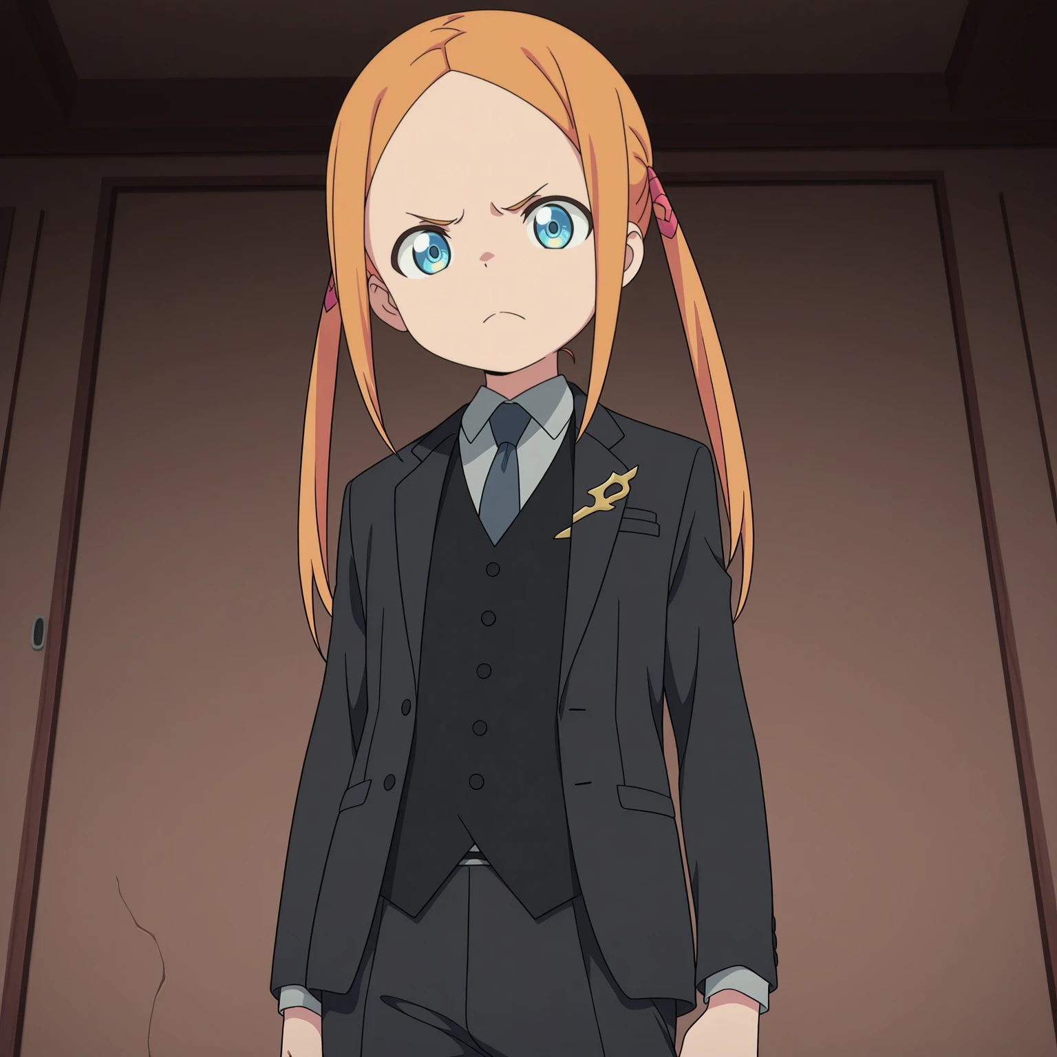 borr, 1boy, blue eyes, orange hair, twintails, long hair, formal, suit, pants