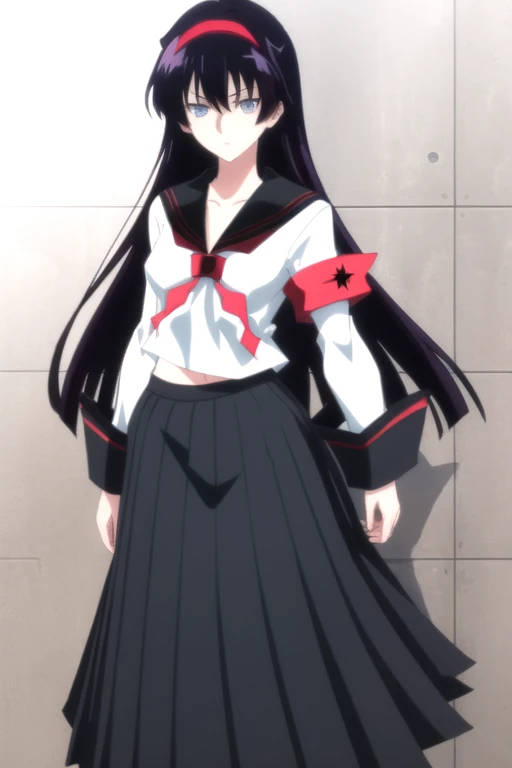 LucaAsakura, 1girl, solo, very long hair, blue eyes, pleated skirt, long skirt, black hair, long sleeves, red hairband, serafuku, sailor collar, star (symbol), armband,