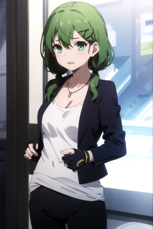 MisaSaotome, 1girl, solo, white shirt, x hair ornament, black gloves, hair between eyes, twintails, jewelry, medium breasts, green eyes, black jacket, green hair, hairclip, pants, fingerless gloves, necklace, open jacket, capri pants