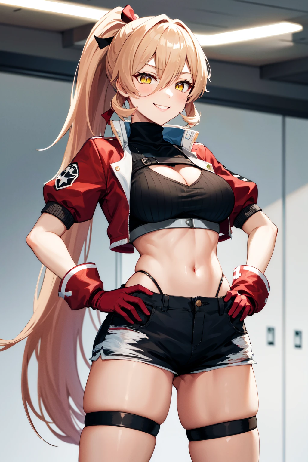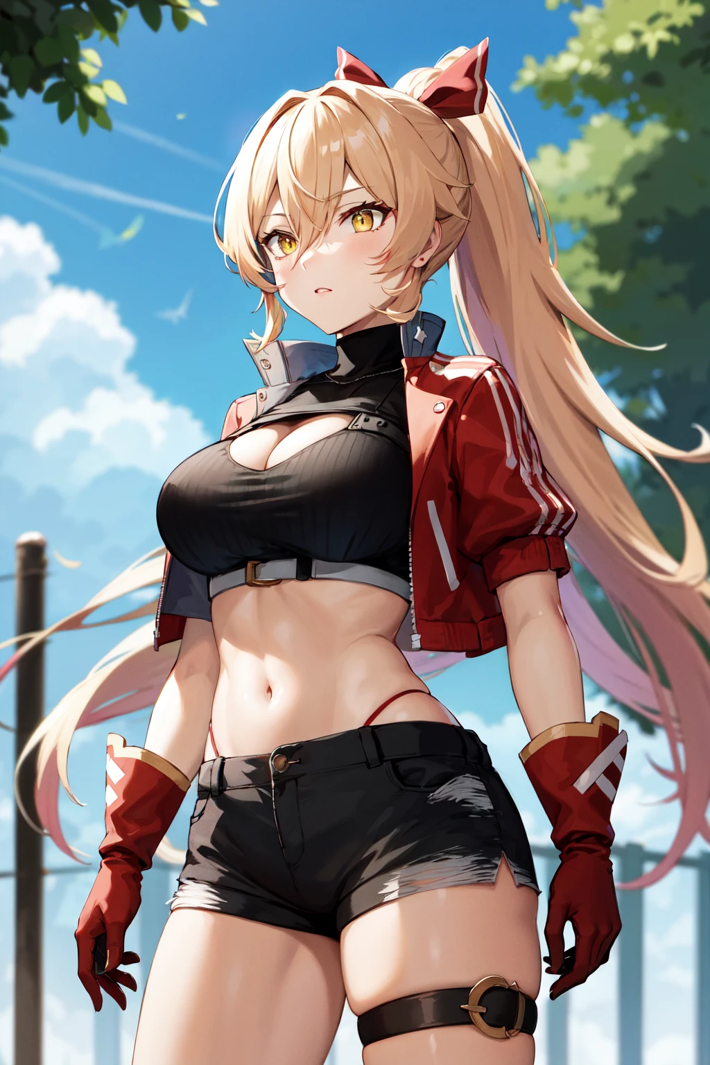 outfit3ccnui, very long hair, blonde hair, ponytail, hair ribbon, hair between eyes, yellow eyes, turtleneck, cleavage cutout, crop top, black shirt, cropped jacket, open jacket, short sleeves, red gloves, black shorts, thigh strap