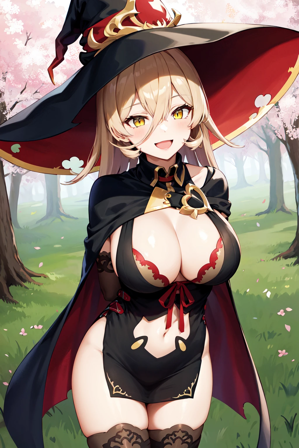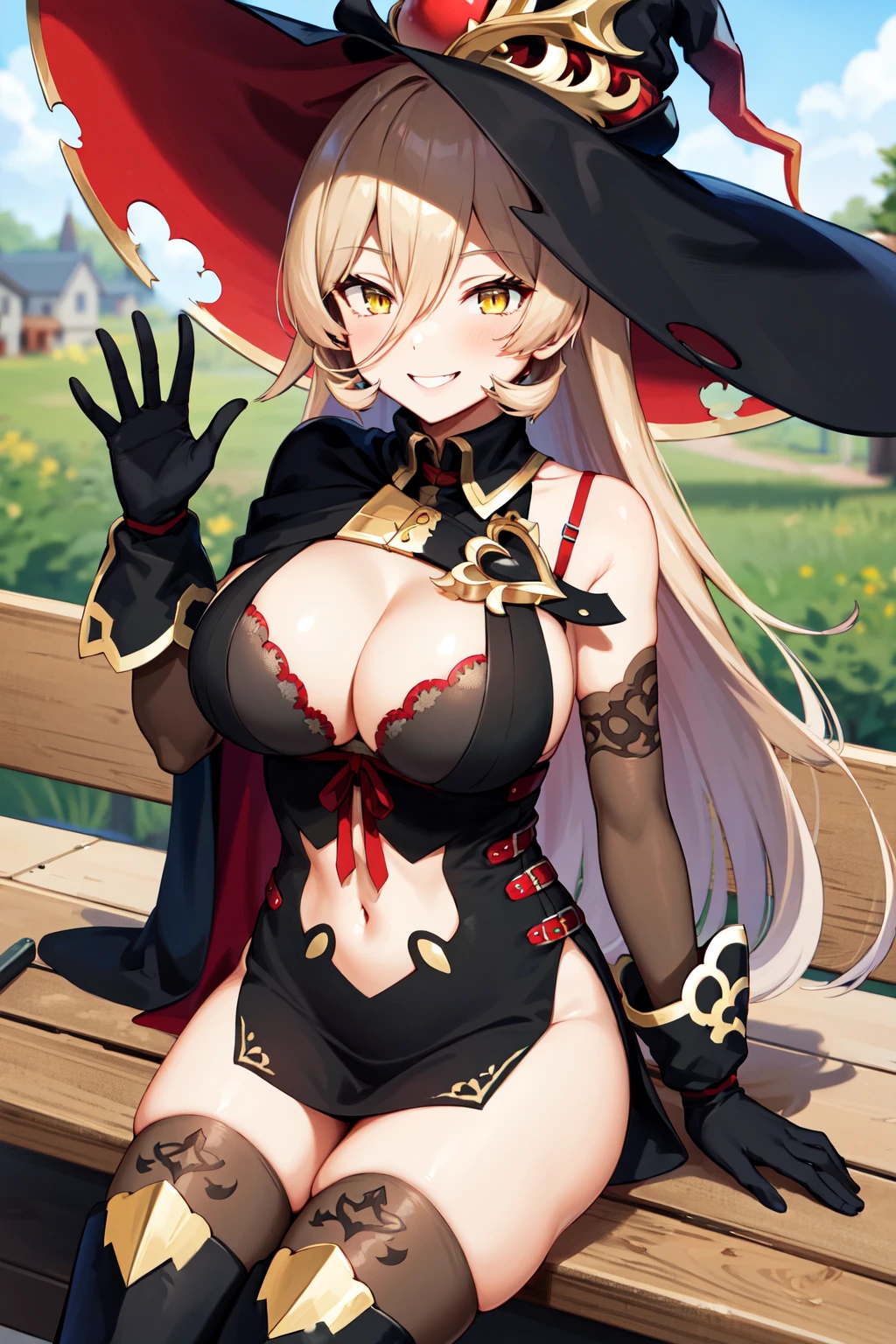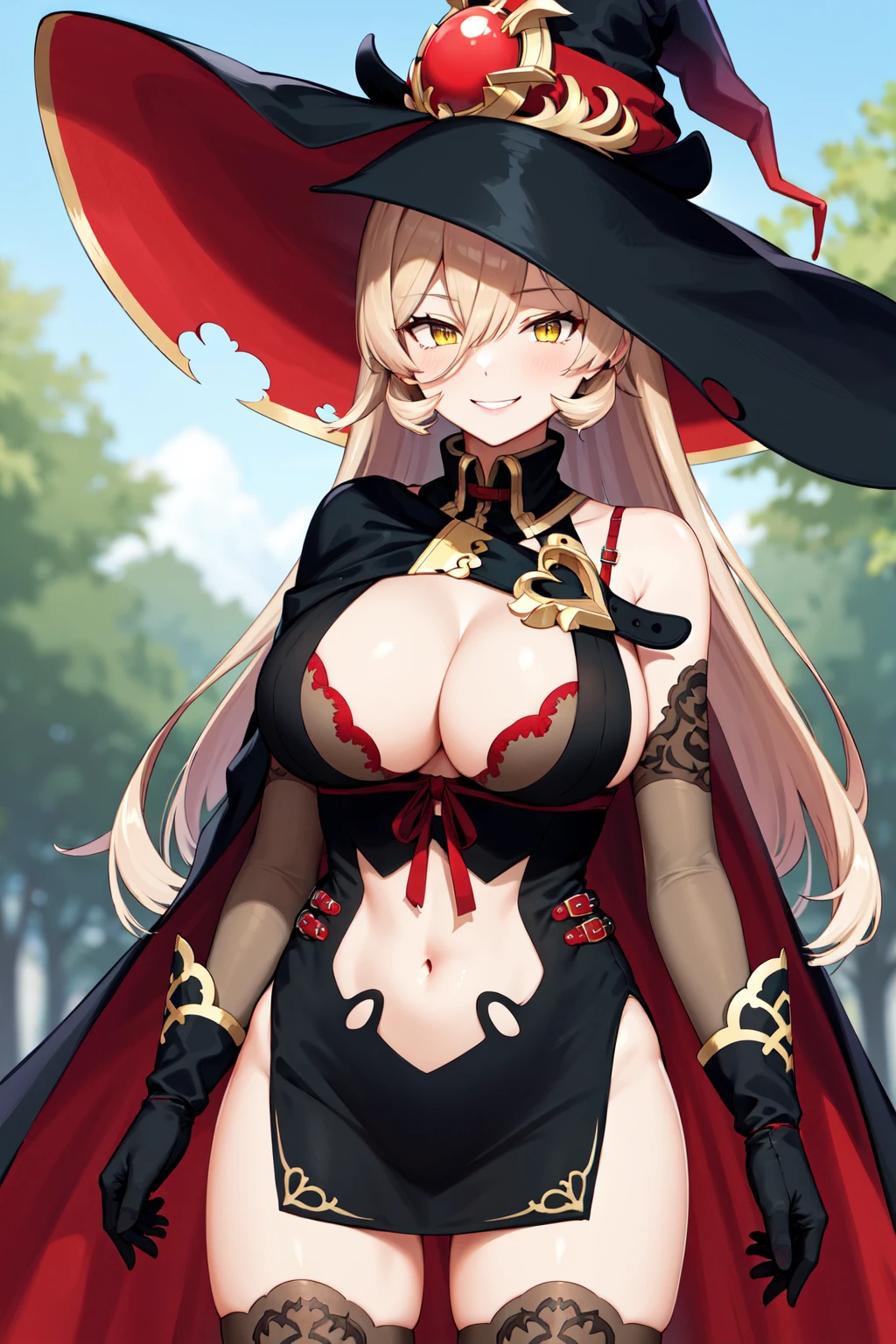 outfit1aanui, long hair, blonde hair, hair between eyes, yellow eyes, witch hat, black headwear, cape, cleavage, bra, clothing cutout, black dress, navel cutout, elbow gloves, black gloves, black thighhighs, thigh boots