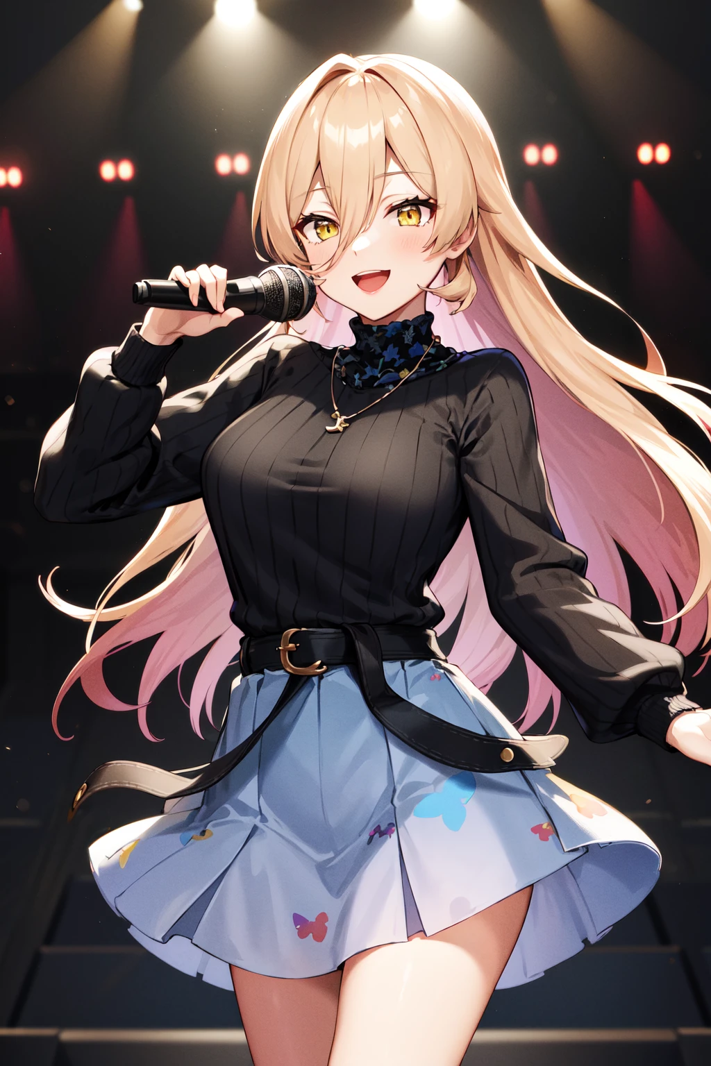 outfit2bbnui, long hair, blonde hair, hair between eyes, yellow eyes, jewelry, necklace, black sweater, long sleeves, black belt, blue skirt, print skirt