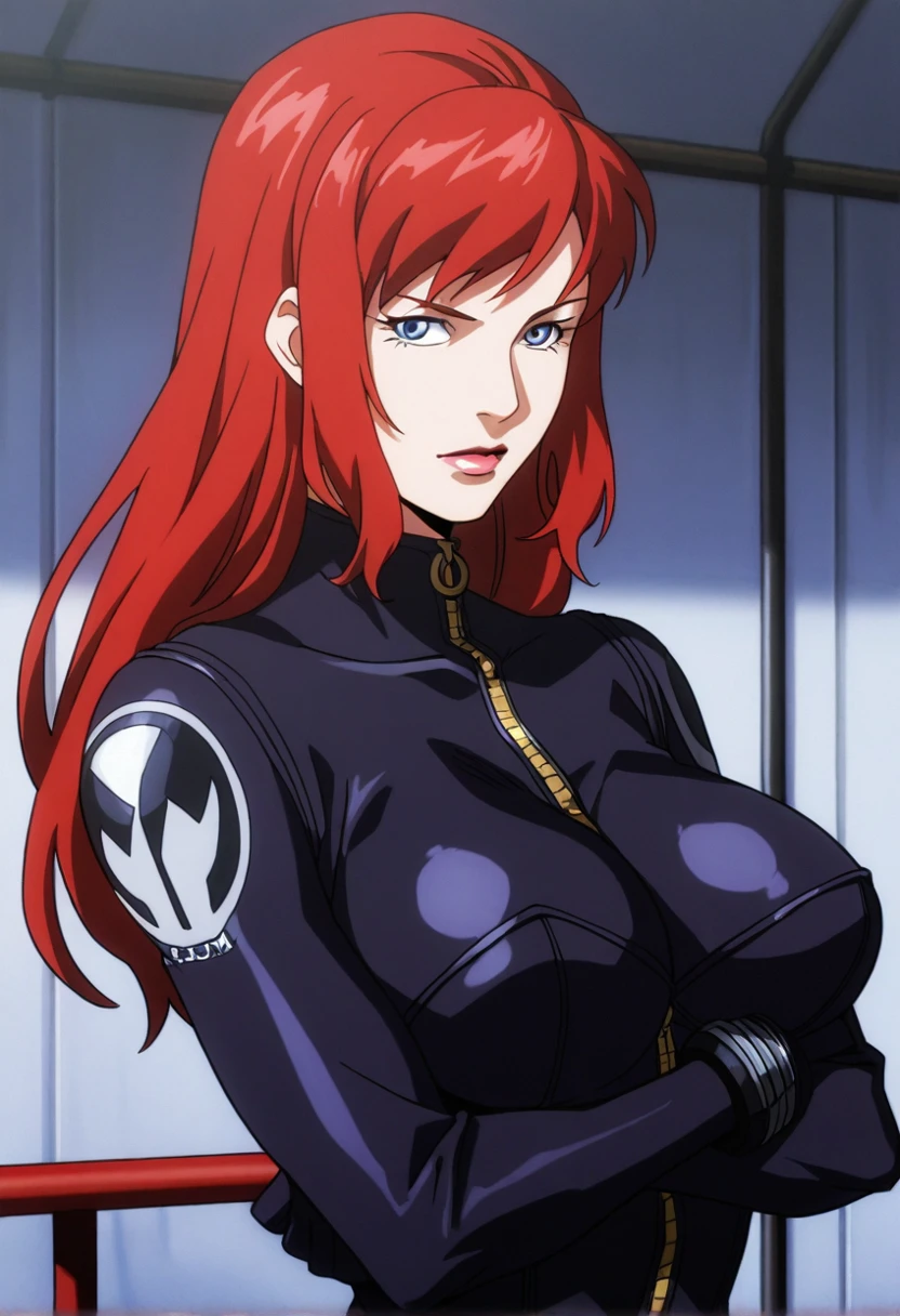 Trigger = bwpm, Tags = 1girl, solo, red hair, long hair, lipstick, blue eyes, black bodysuit, zipper, belt, fingerless gloves