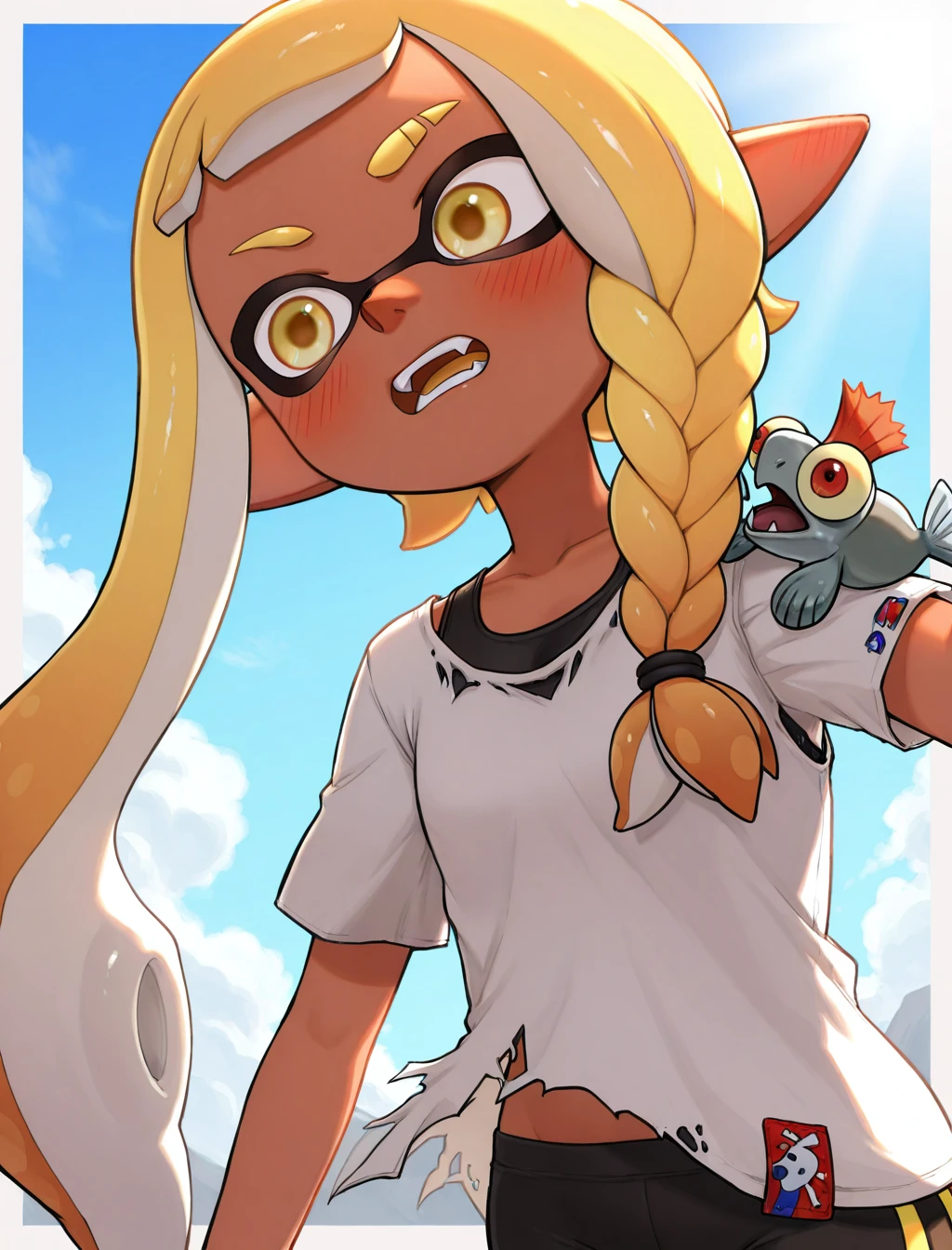 black bra, white shirt, torn shirt, grey cloak, torn cloak, black shorts, multicolored boots