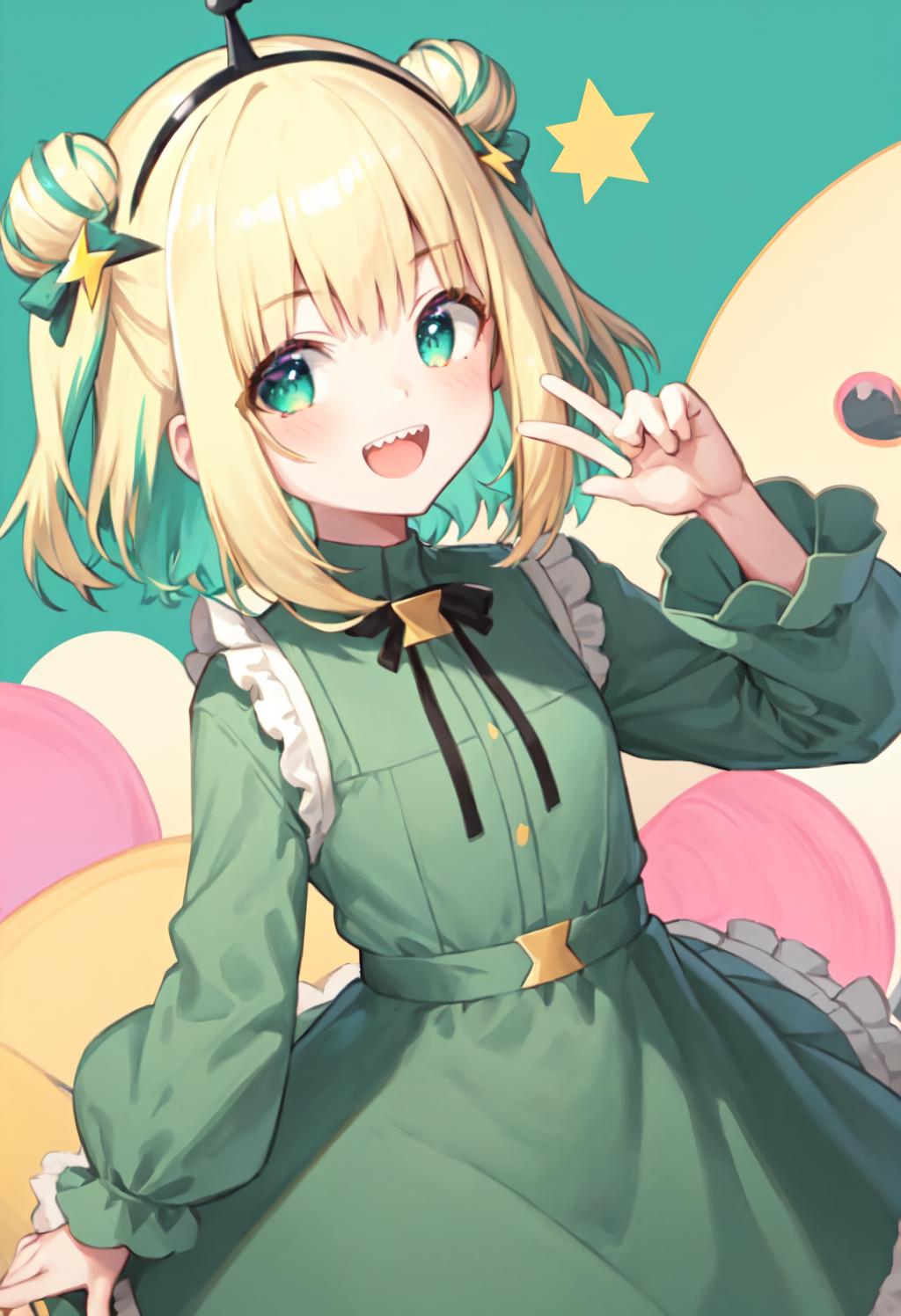 isekaipika: blonde hair, green eyes, multicolored hair, green hair, hair bun, long sleeves, teeth, two-tone hair, hairband, double bun, hair ornament, streaked hair, green shirt, two side up, bow, puffy long sleeves, dress, puffy sleeves, frills, green dress, bangs, star hair ornament, skirt, star (symbol), shirt, black hairband
