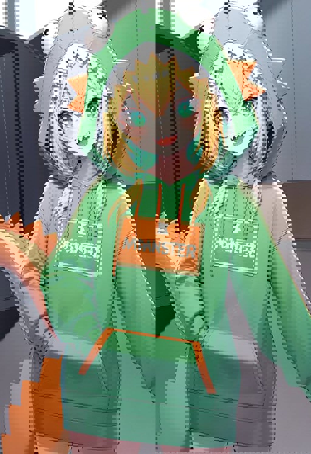 dinopika: green hoodie, sharp teeth, hood, hoodie, blonde hair, tail, green hair, multicolored hair, looking at viewer, white pupils, two-tone hair, blush stickers, bright pupils, nail polish, green eyes, green nails, hair between eyes, twintails, long sleeves, hood up, bangs