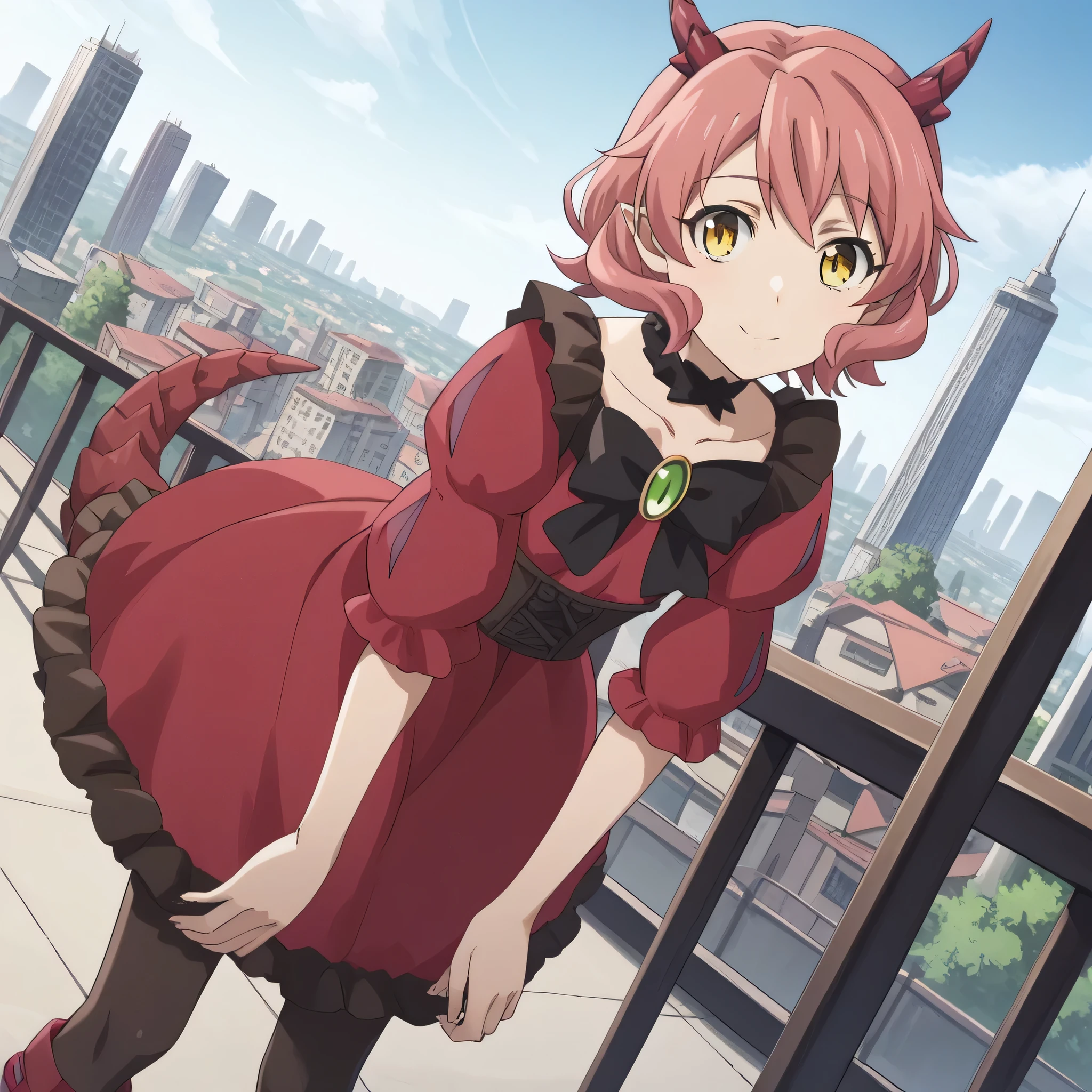 dress, bow, tail, pantyhose, red dress, red footwear, bloomers, frills, collarbone, gemstone, juliet sleeves, puffy sleeves, choker,