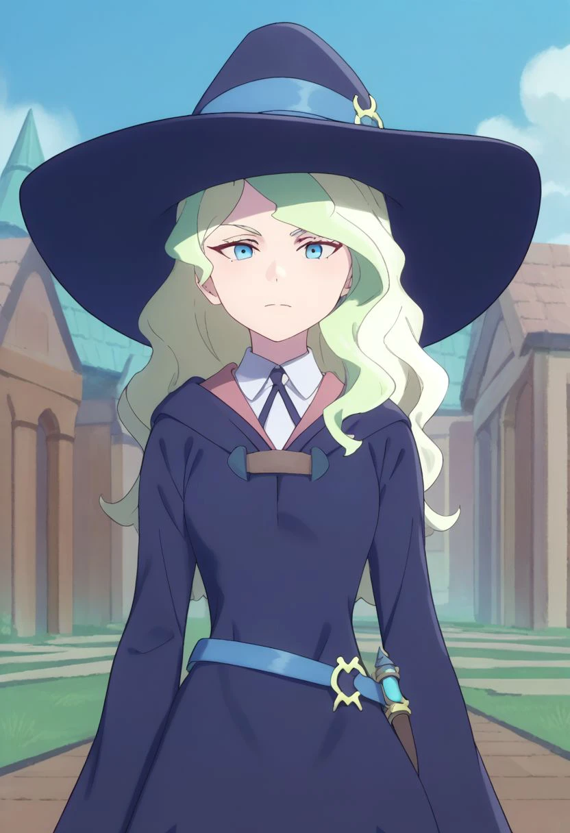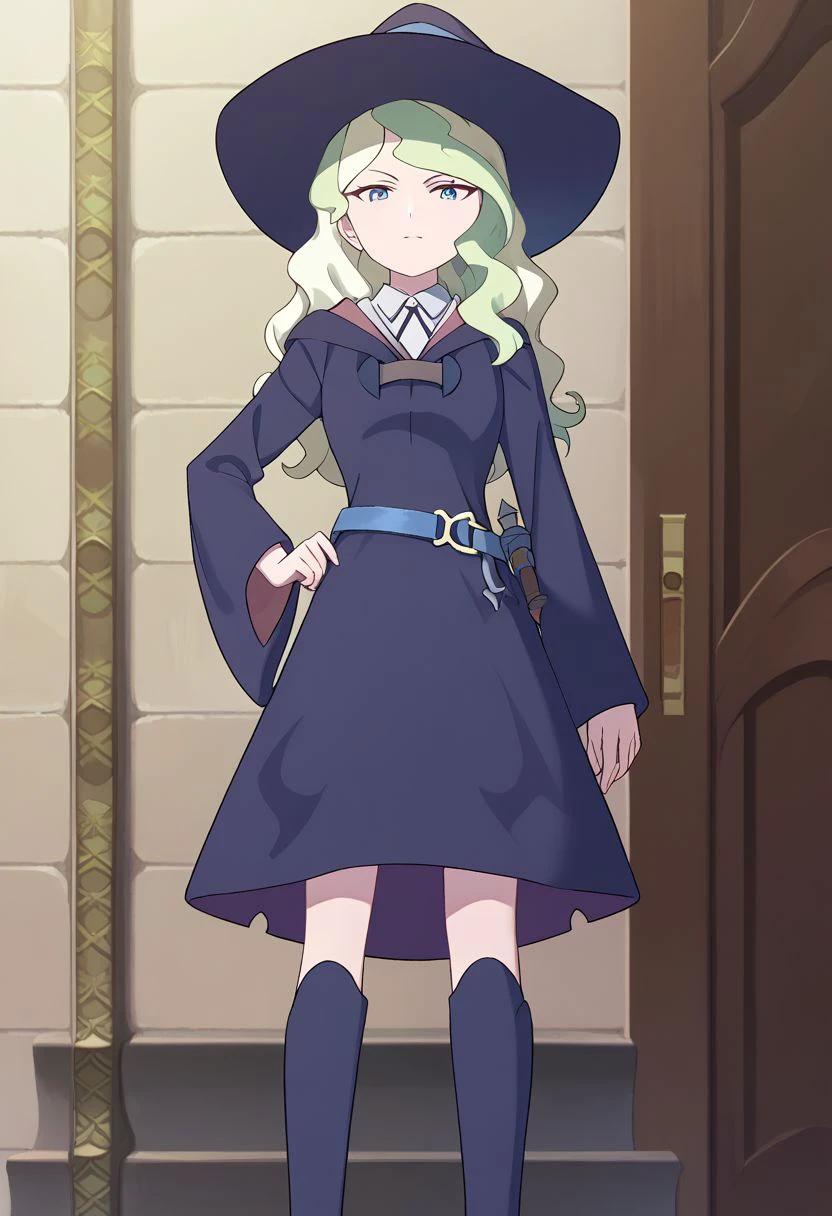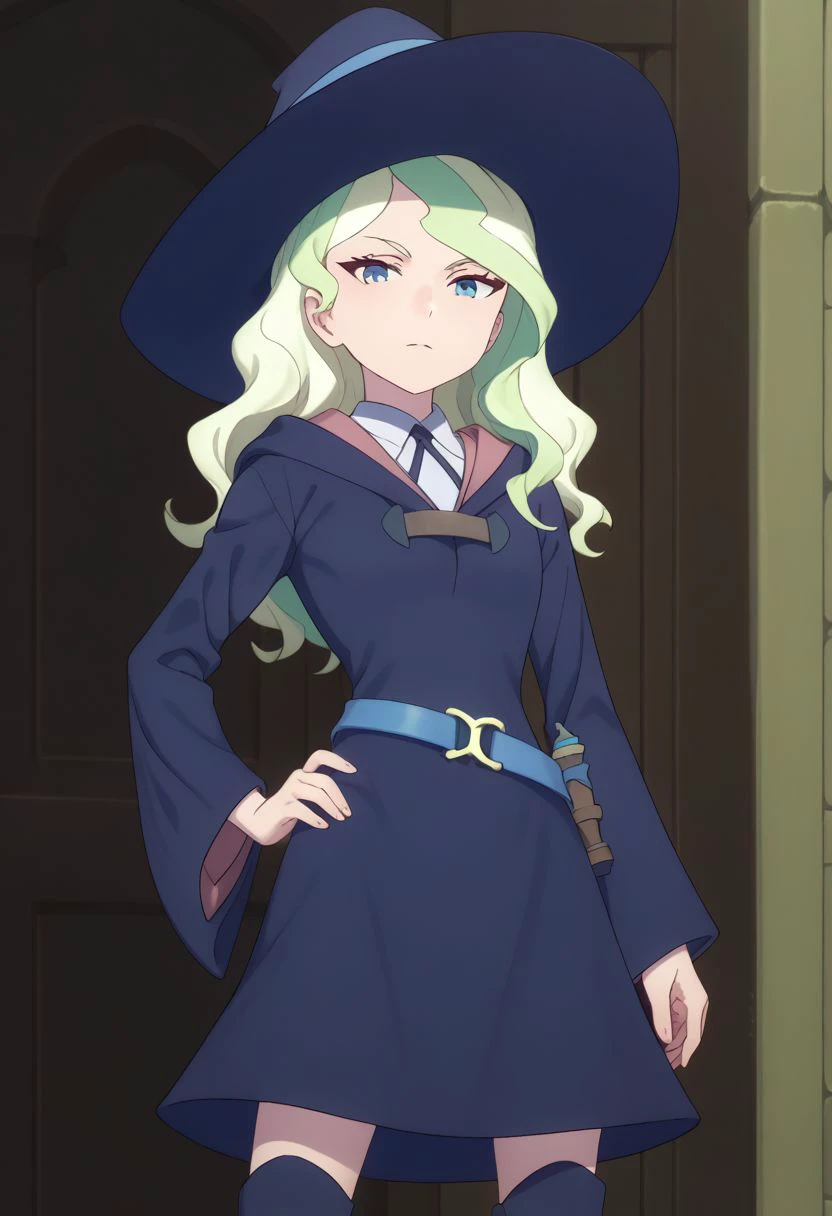 Uniform #1: diana, 1girl, hat, blue eyes, long hair, witch hat, light green hair, witch, dress, luna nova school uniform, boots, school uniform, blonde hair, thighhighs, multicolored hair,