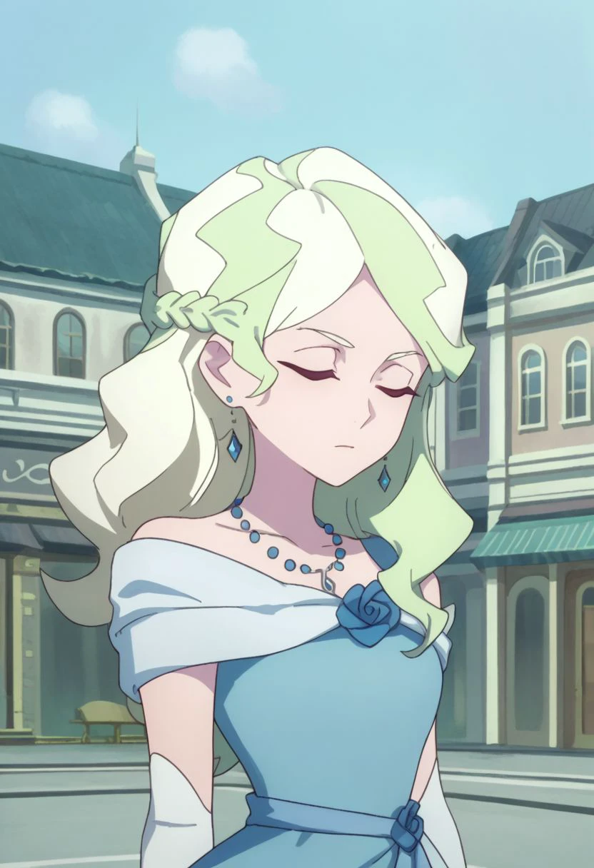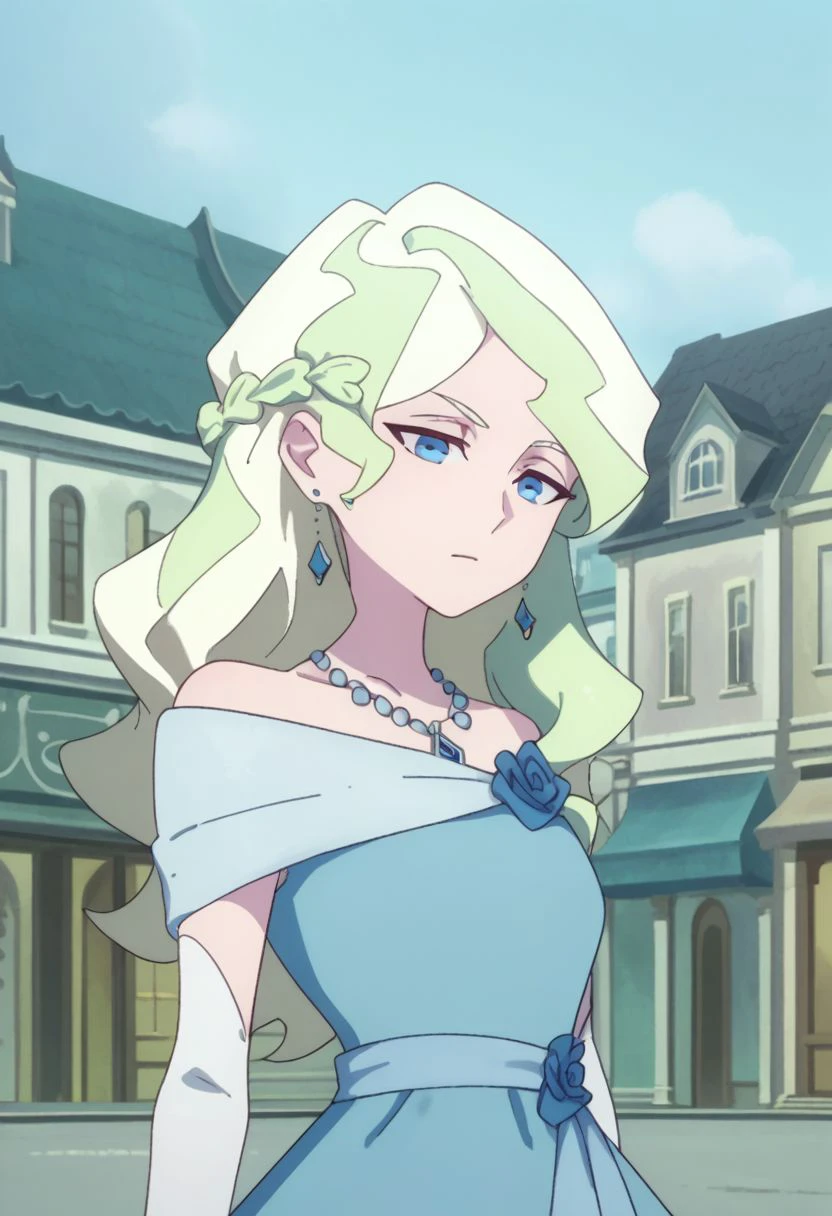Dress: diana, 1girl, blue eyes, jewelry, dress, blonde hair, necklace, long hair, multicolored hair, earrings, elbow gloves, blue dress, formal, light green hair, flow,