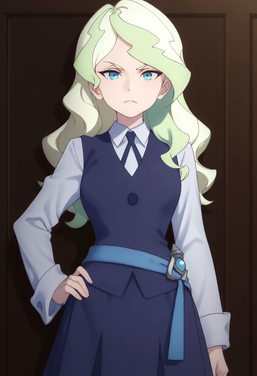 Uniform #2: diana, 1girl, blue eyes, school uniform, long hair, luna nova school uniform, blonde hair, skirt, light green hair, multicolored hair, long sleeves, shirt, two-tone hair, white shirt,