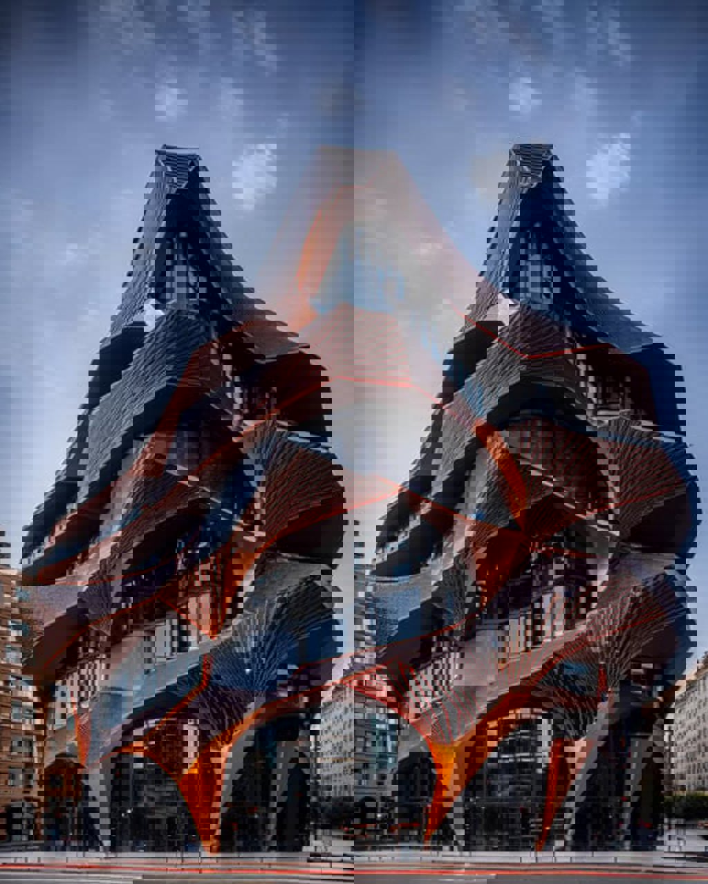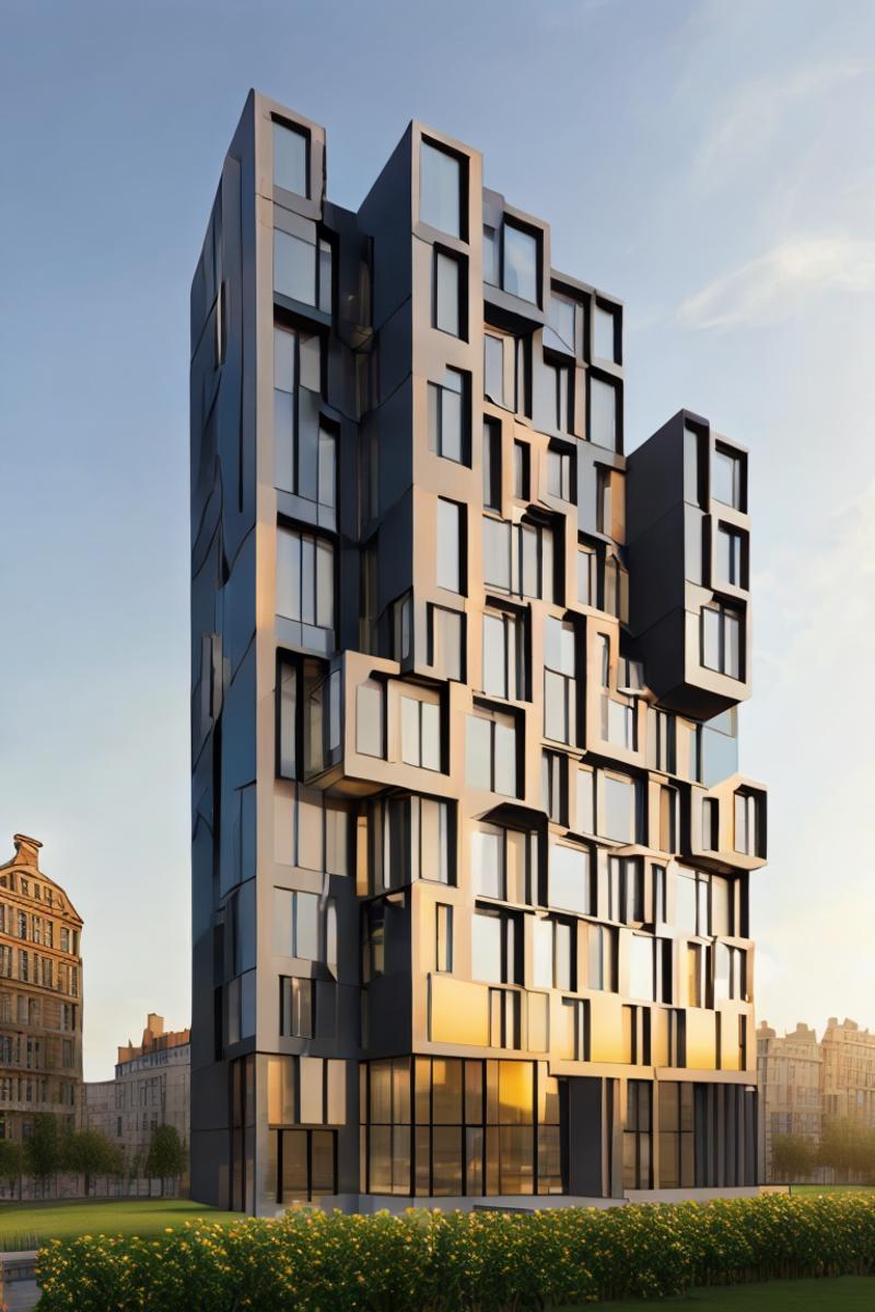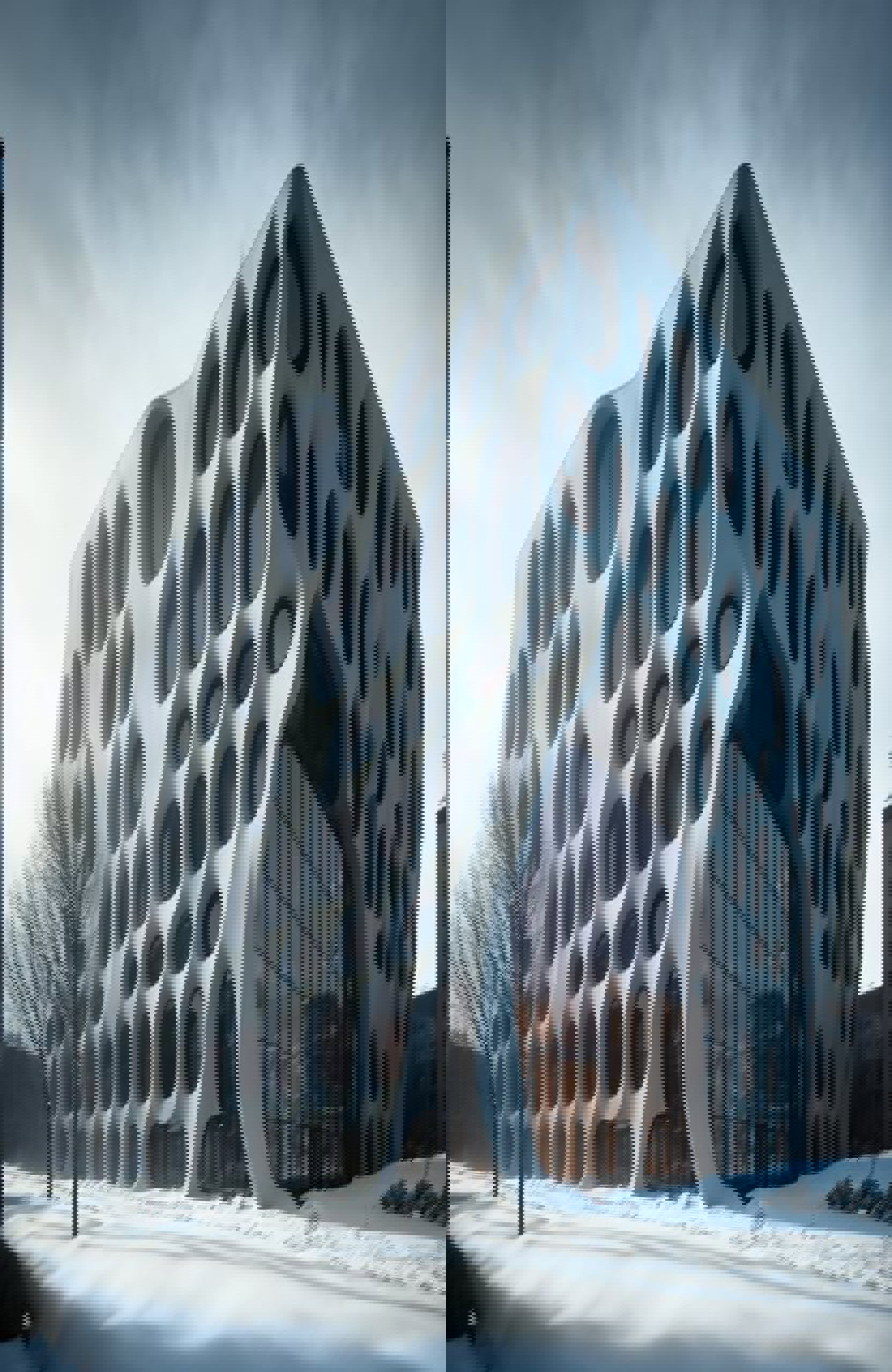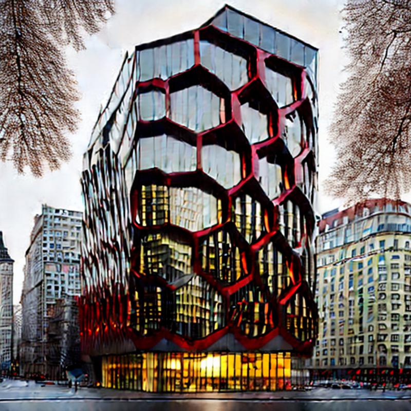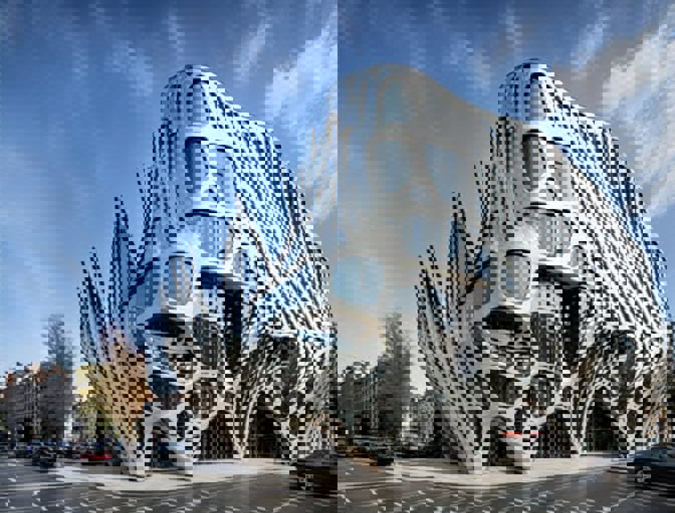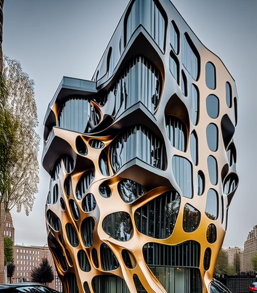 "a photo of a parametric building midjourneyi, waves, roots, veins, many windows, in a street."