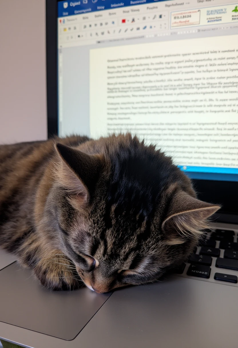 Allie is a 10 year old, 10 pound fluffy tabby ball of crazy. I rescued her at around 1 year of age, and she's been an amazing little fuzzy buddy ever since - often close-by on any sort of video call or important matter where she's not needed. Here's a few non-AI pics of her for reference: