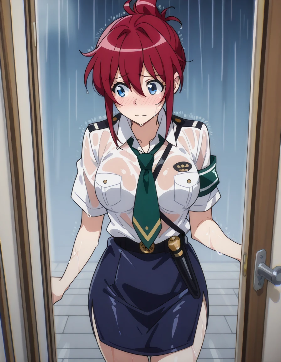 blue jacket, blue skirt, green neckwear, pantyhosedress shirt, blue skirt, green neckwearblazer, striped necktie, plaid skirtcompetition swimsuit, life vest