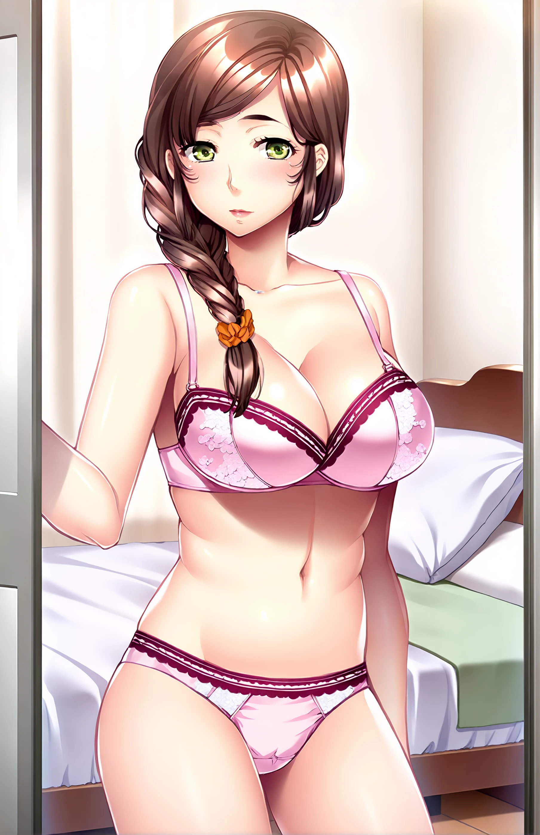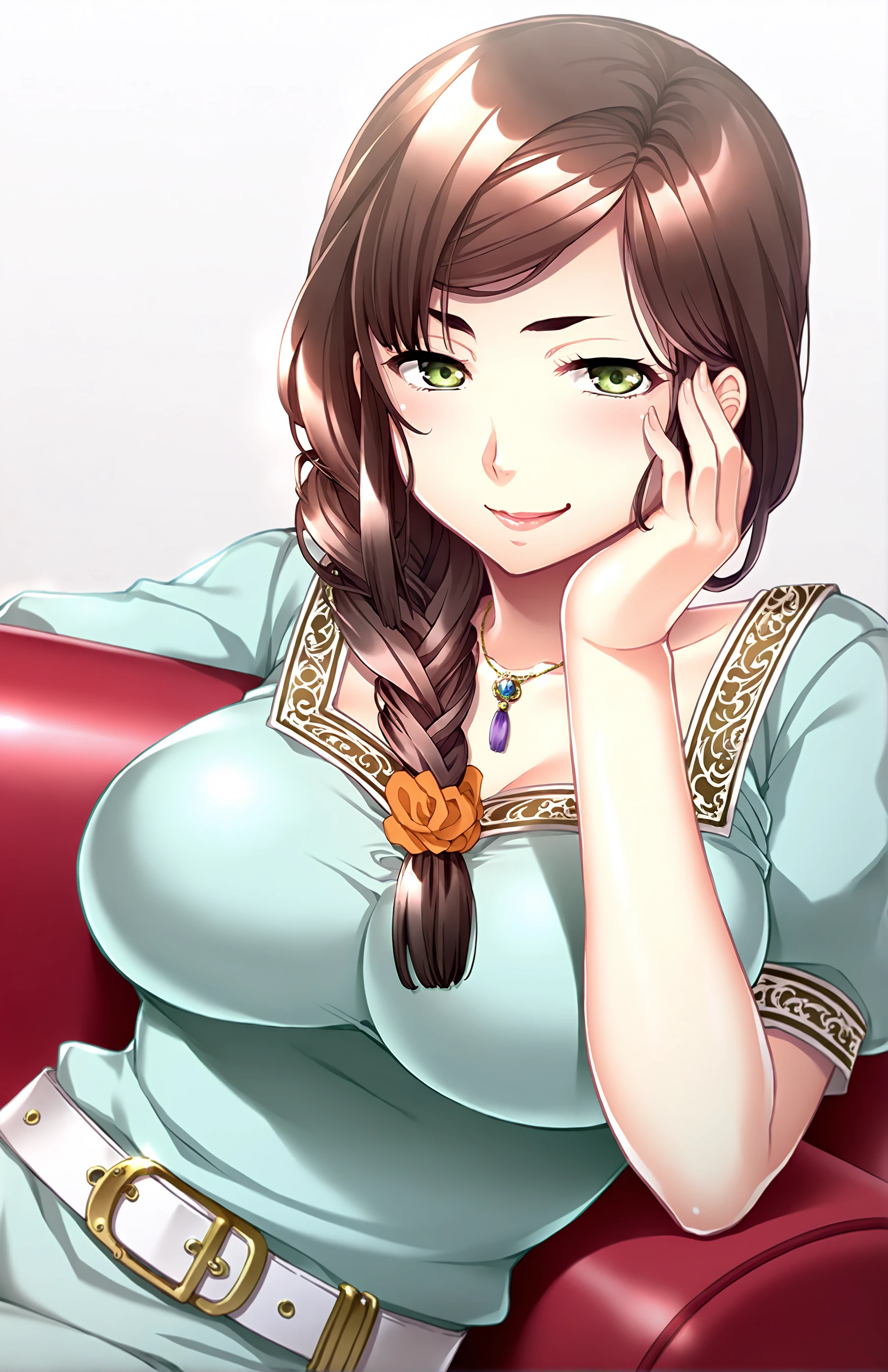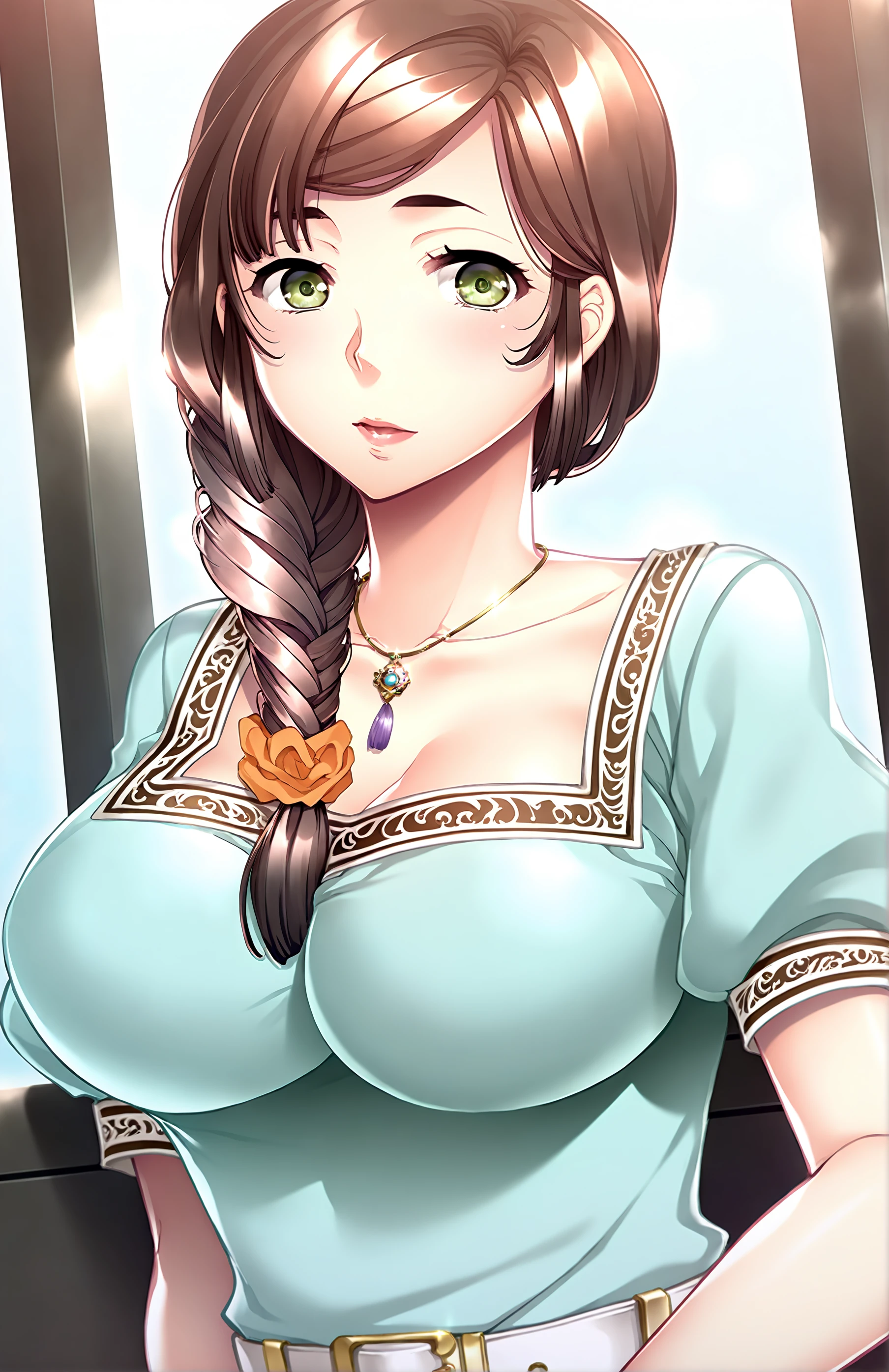 ShiinaKazuha, long hair, breasts, large breasts, brown hair, braid, single braid, hair over shoulder, green eyes