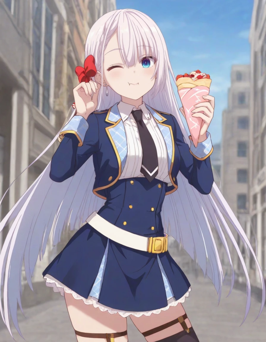 hair bow, blue eyes, school uniform, blue jacket, white collared shirt, black necktie, long sleeves, blue skirt, white belt, belt buckle, layered skirt, frilled skirt, thigh strap, black thighhighs, black footwear