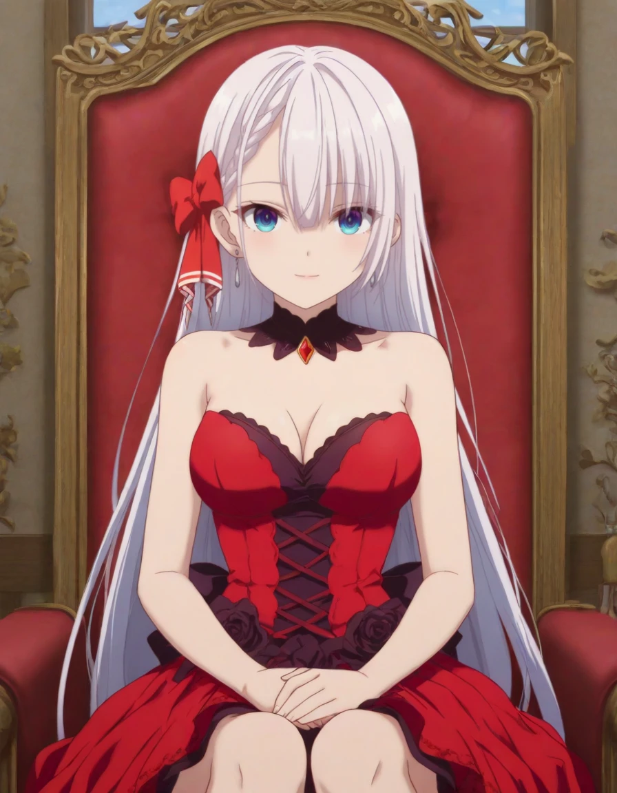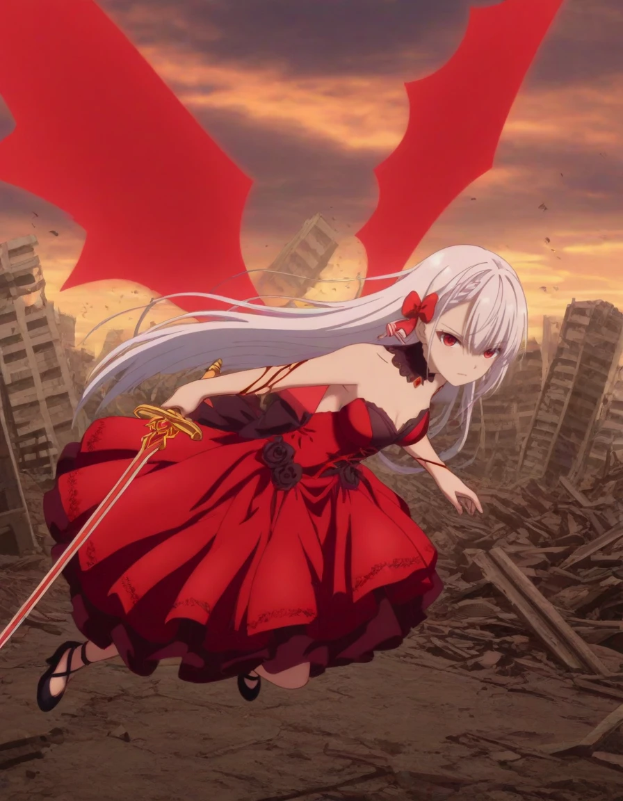 hair bow, red eyes, collarbone, cleavage, vampire queen outfit, black choker, red gem, red bat wings, red dress, backless dress, strapless dress, cross-laced dress, blood on arm, layered dress, black rose, back bow, black footwearDescription