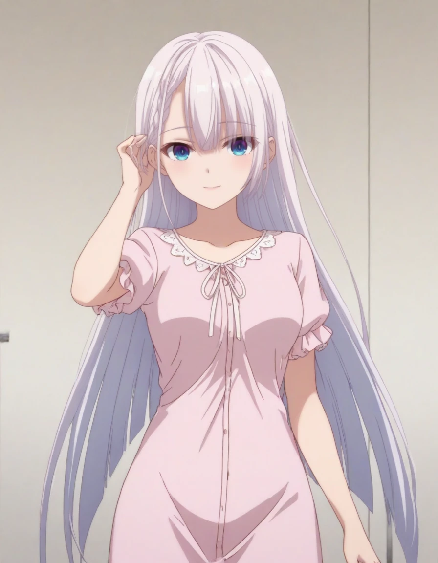 blue eyes, pink nightgown, frills, ribbon, puffy short sleeves