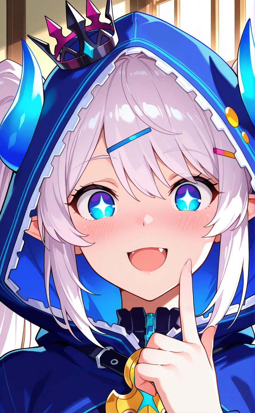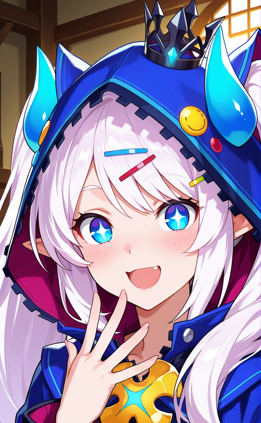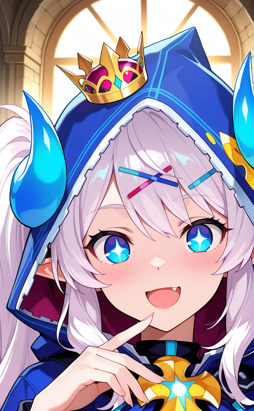 mini crown,blue horns,white hair,long hair,twintails,pointy ears,hair ornament,hairclip,blue eyes,star-shaped pupils,open mouth,fang