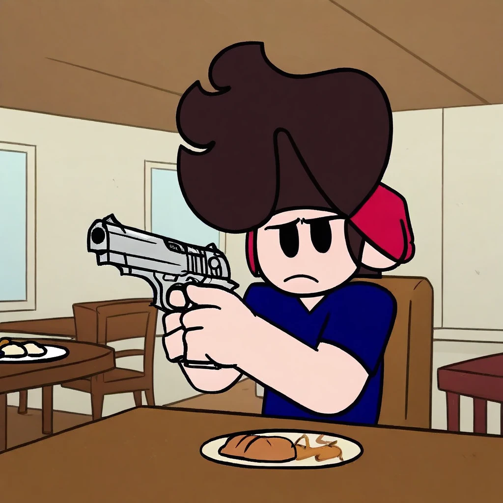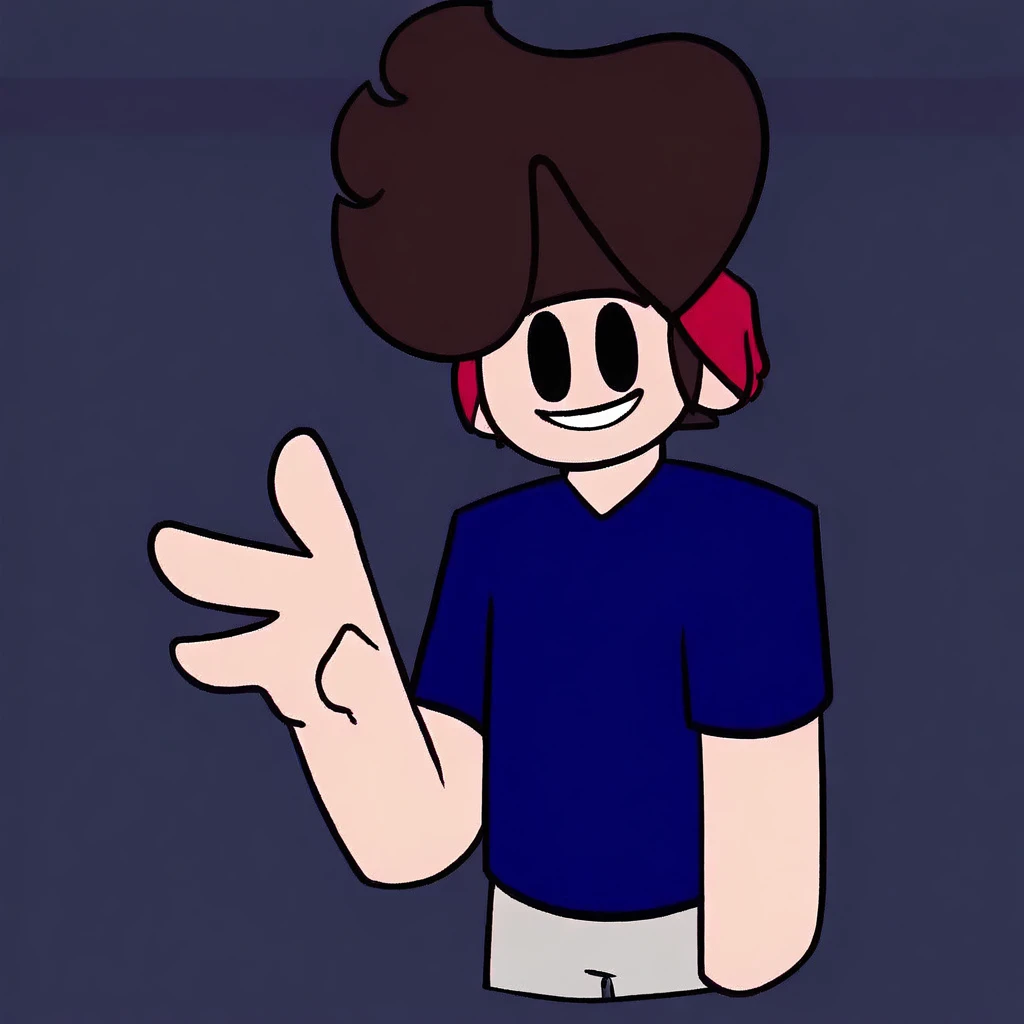 Brody_(BrodyAnimates), 1boy, solo, brown hair, black eyes, red hat, blue shirt, grey pants