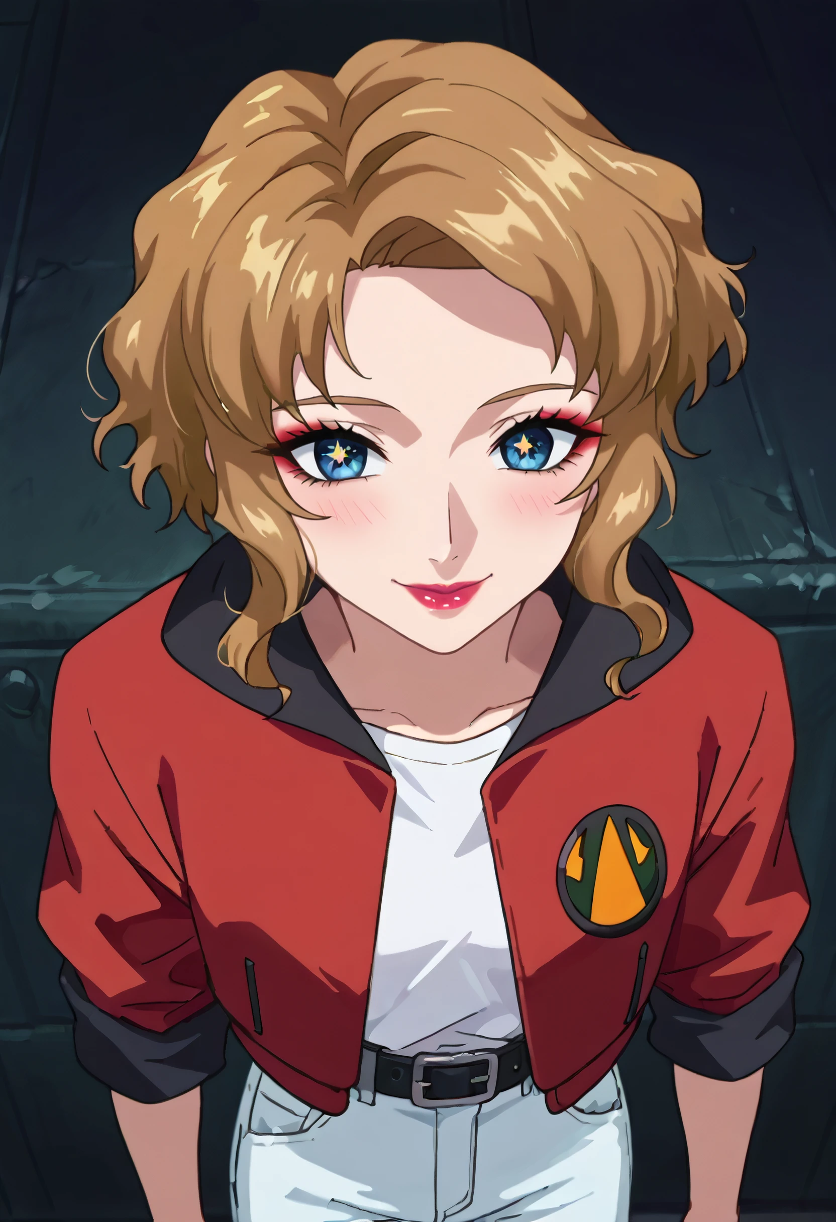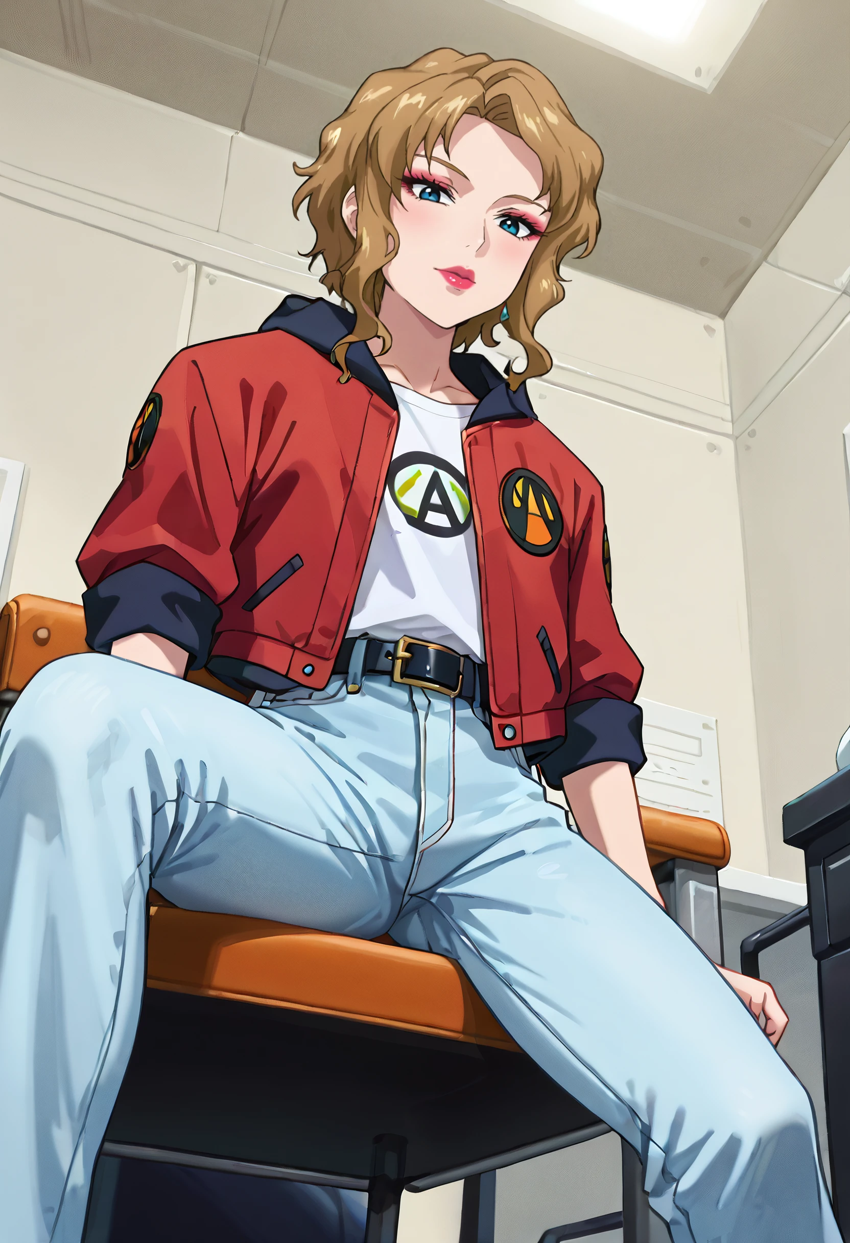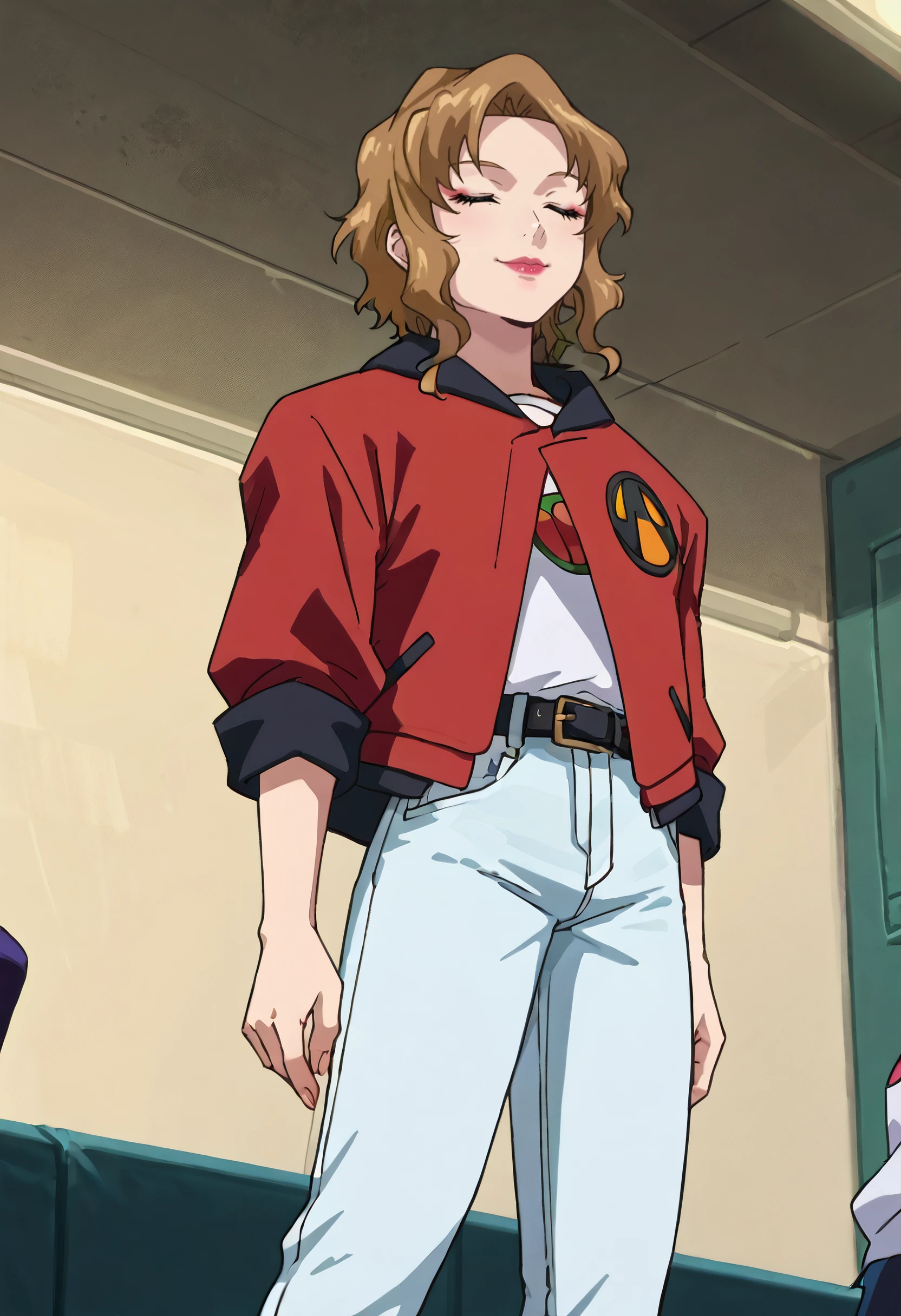 EricaOutfit, white pants, red jacket, pants, jacket, shirt, jeans, belt, denim, hood, baggy clothes, hood down, black belt, white shirt, undershirt, sleeves rolled up,