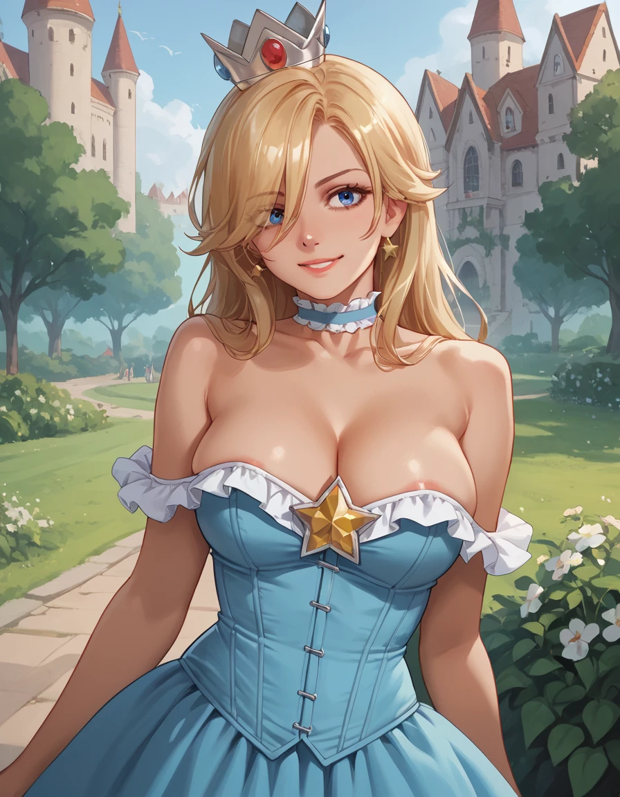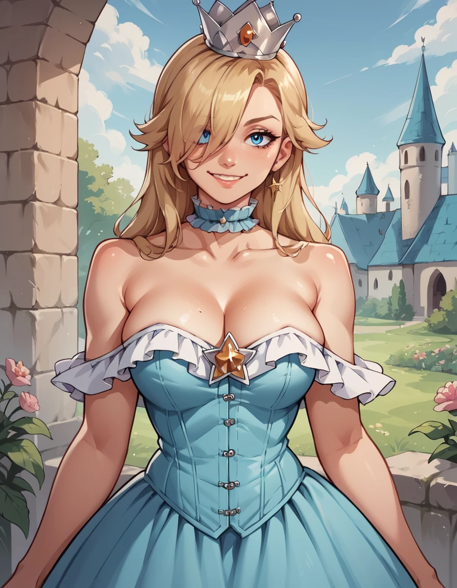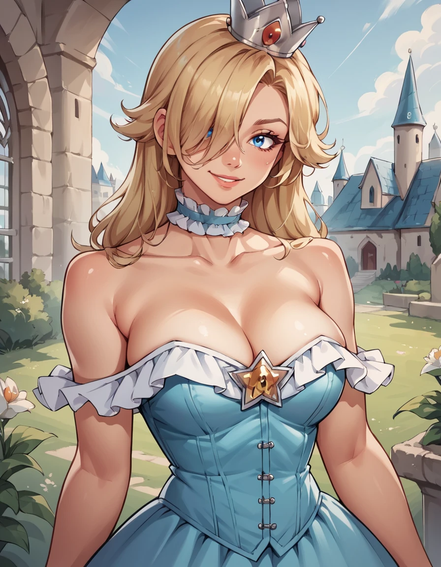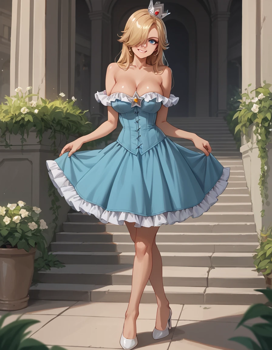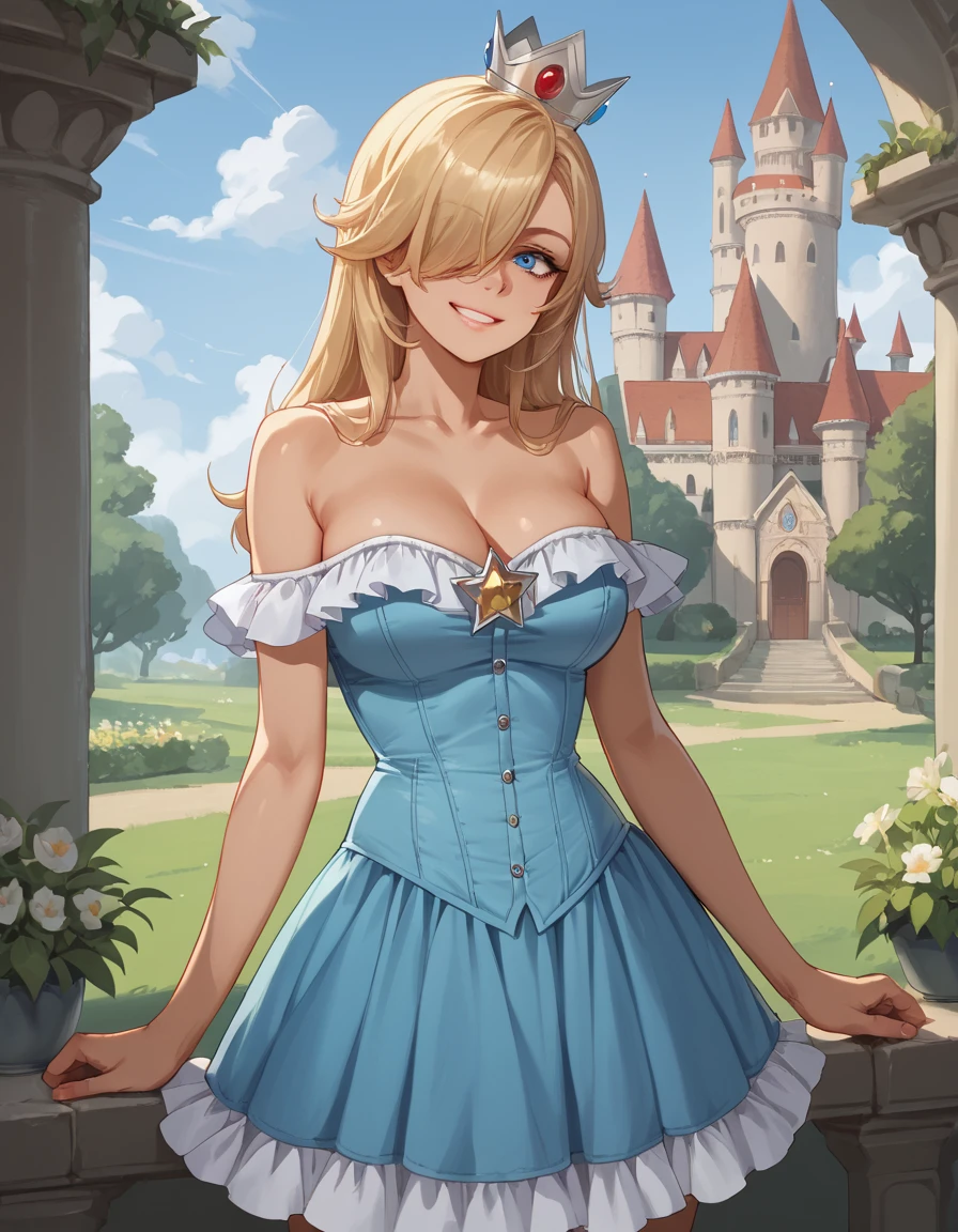 Character: 1girl, long blonde hair, hair over one eye, hud_crst_prncss_drss, bare shoulders, corset, off shoulder, blue dress, short dress, frills, crown, choker
