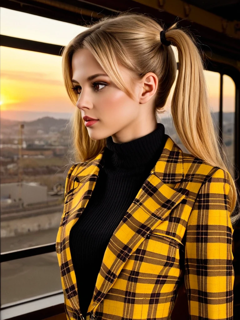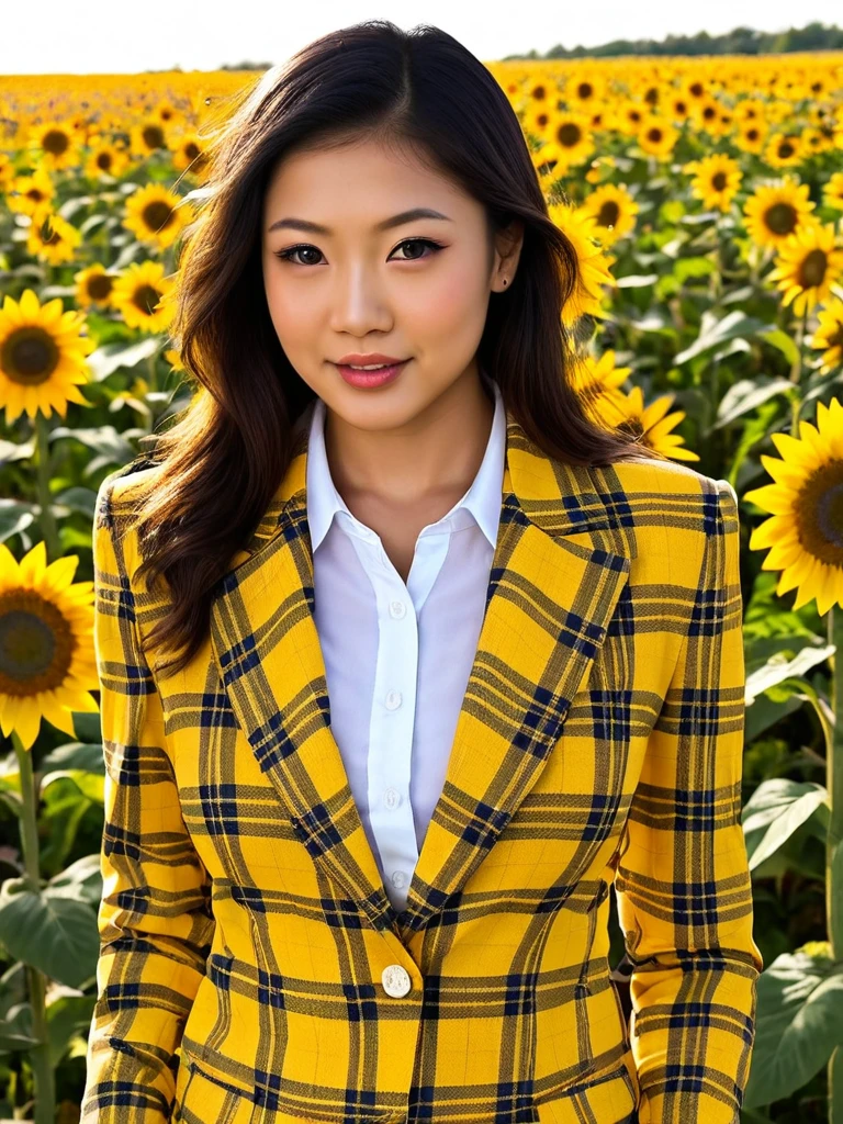 yellow plaid blazer, matching plaid pleated skirt, yellow tartan, white shirt, yellow cardigan, white knee high socks.