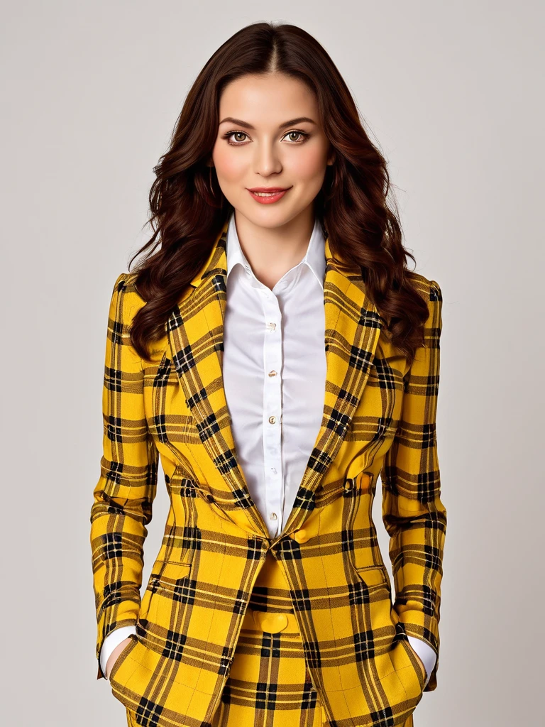 The Look: The "Total Betty" of 90s fashion—a bold, yellow tartan power suit that defined Beverly Hills preppy style and became the most recognizable outfit of the decade.