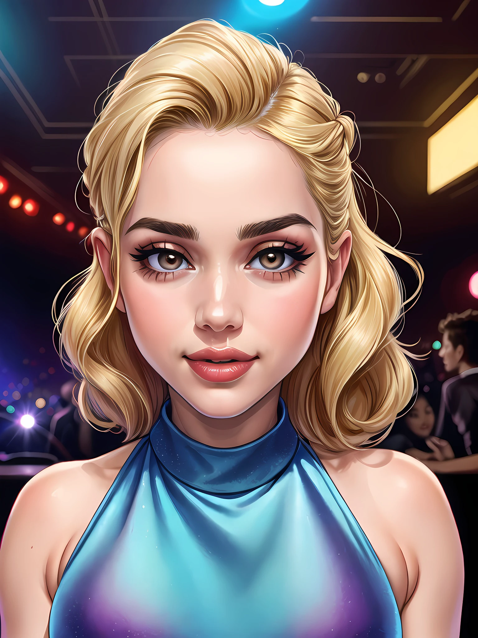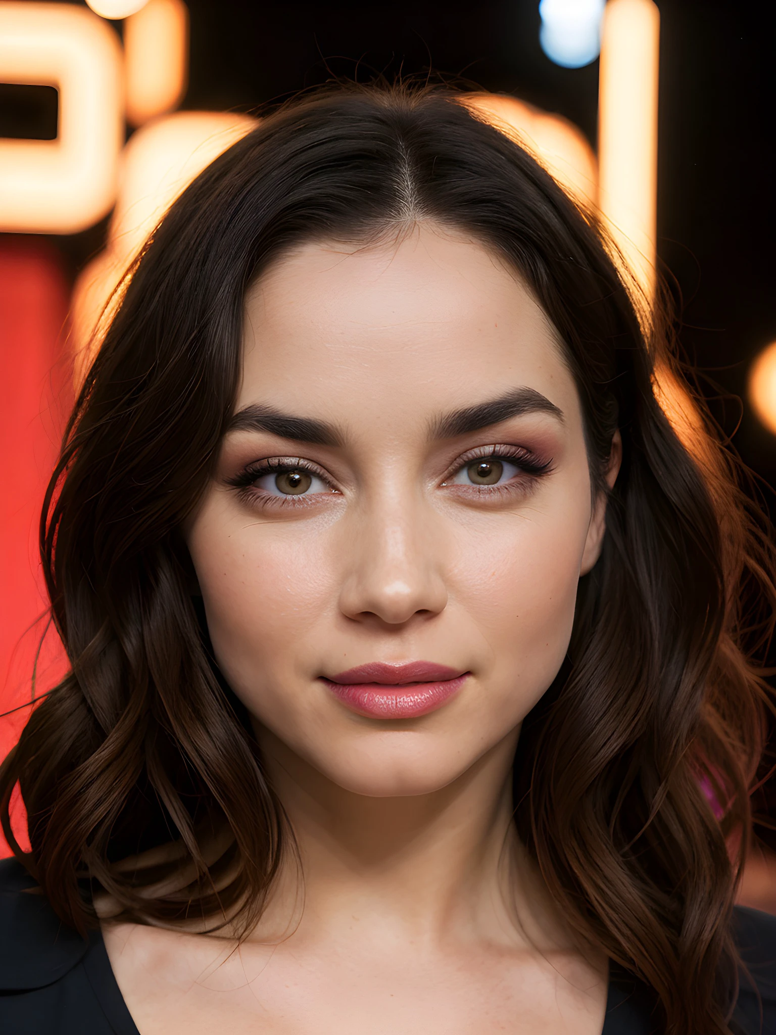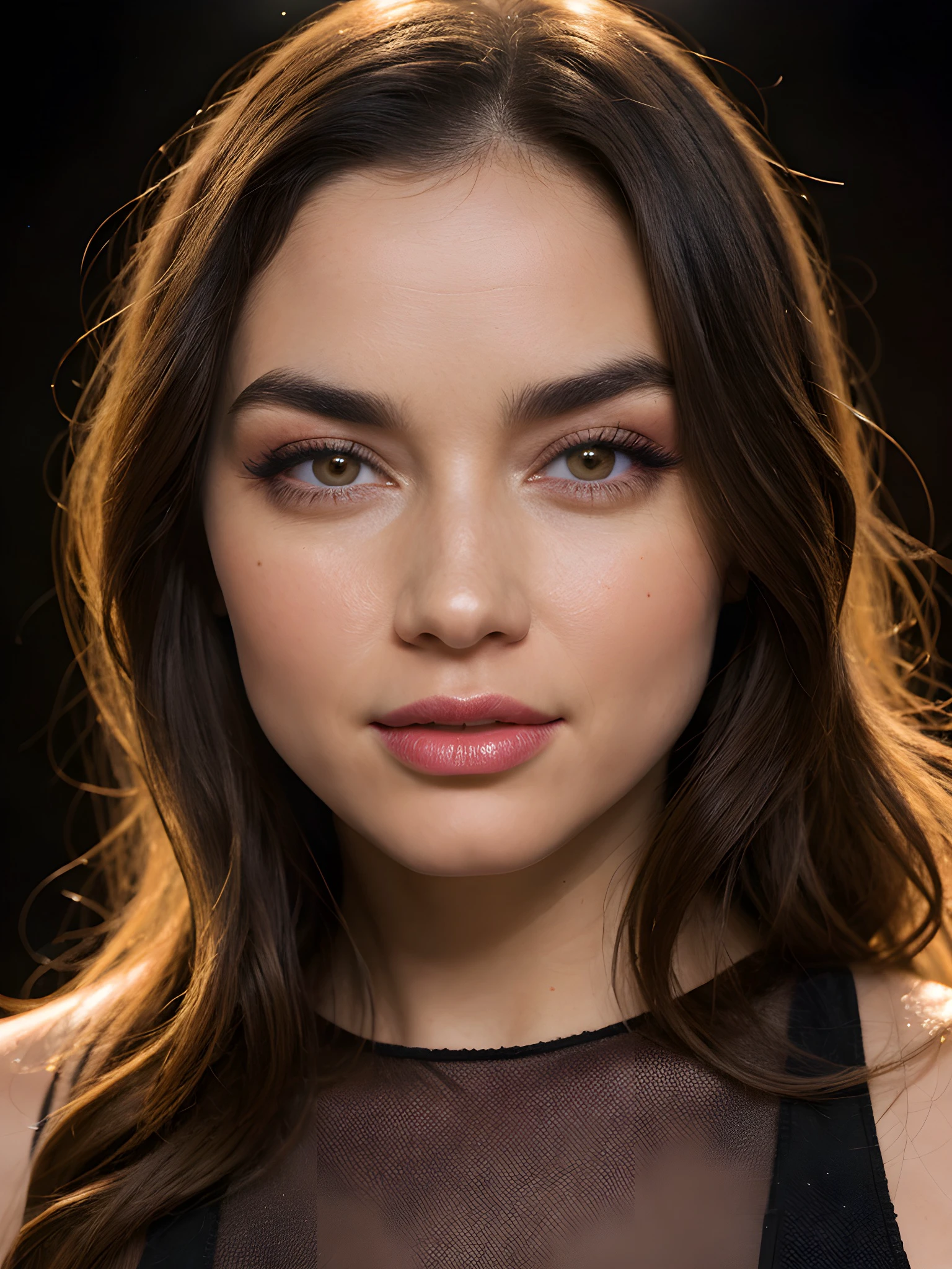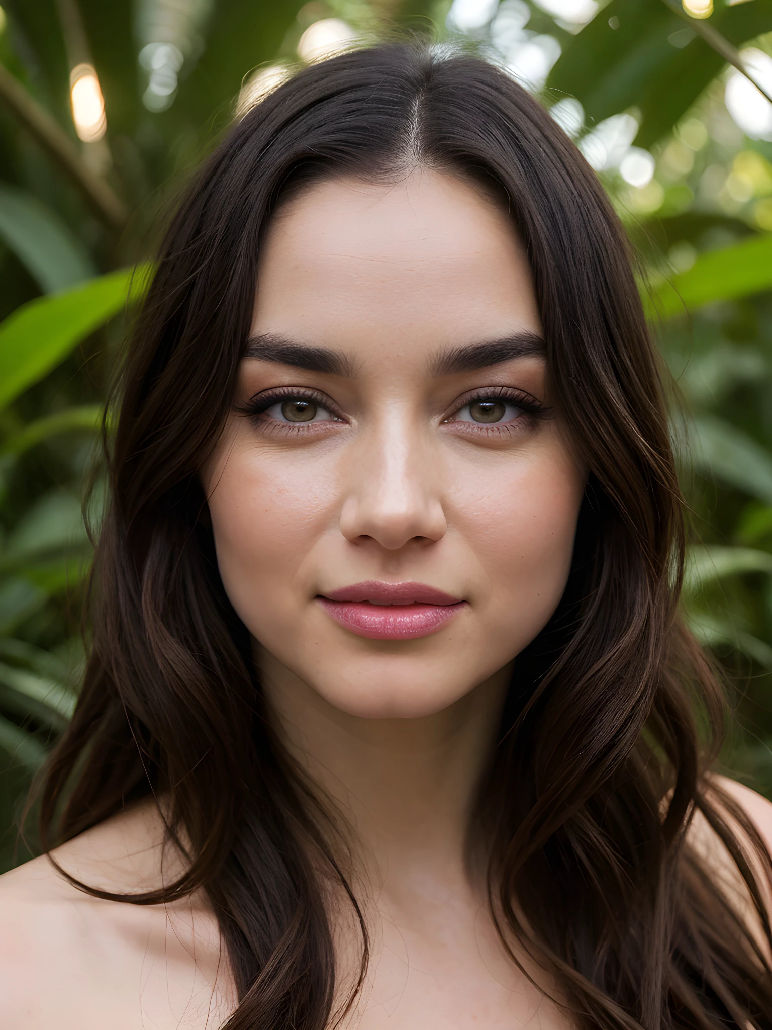 Useful prompts: woman, lips, brown eyes, brown hair, long hair, black hair, smile, bare shoulders, teeth, parted lips, grin, cleavage, medium hair, closed mouth, makeup, red lips, messy hair, ponytail, ???????, lipstick