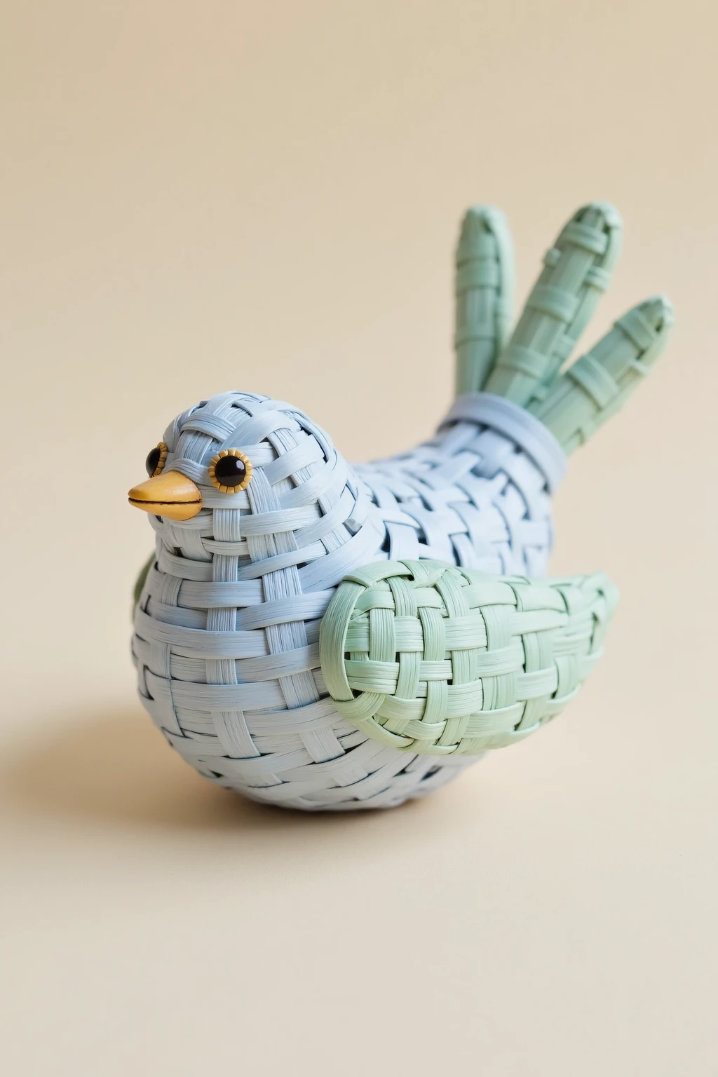 Woven texture and pastel color scheme, design a woven bird ornament, light blue and mint green, delicate feathers, add a touch of freshness.
