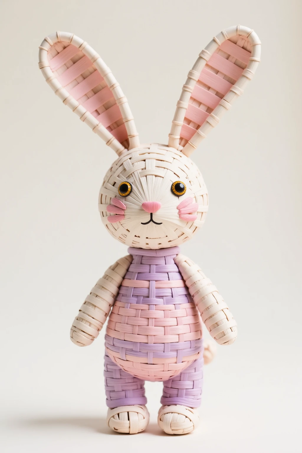 Woven texture and pastel color scheme, produce a woven rabbit figure, pastel pink and white, long ears, full of cuteness.