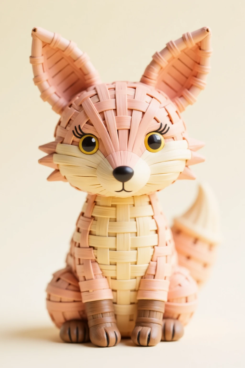 Woven texture and pastel color scheme, design a woven fox figurine, orange and light yellow, sly expression, full of fun.