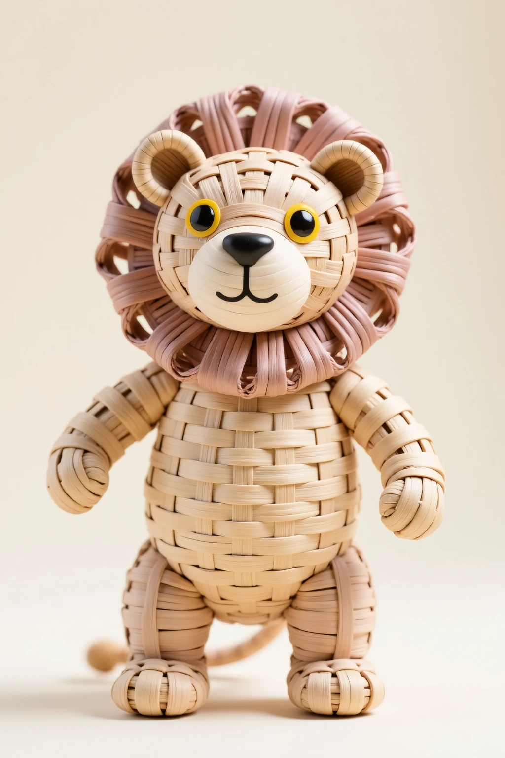 Woven texture and pastel color scheme, create a woven lion model, light brown and beige, mighty posture, showing strength.