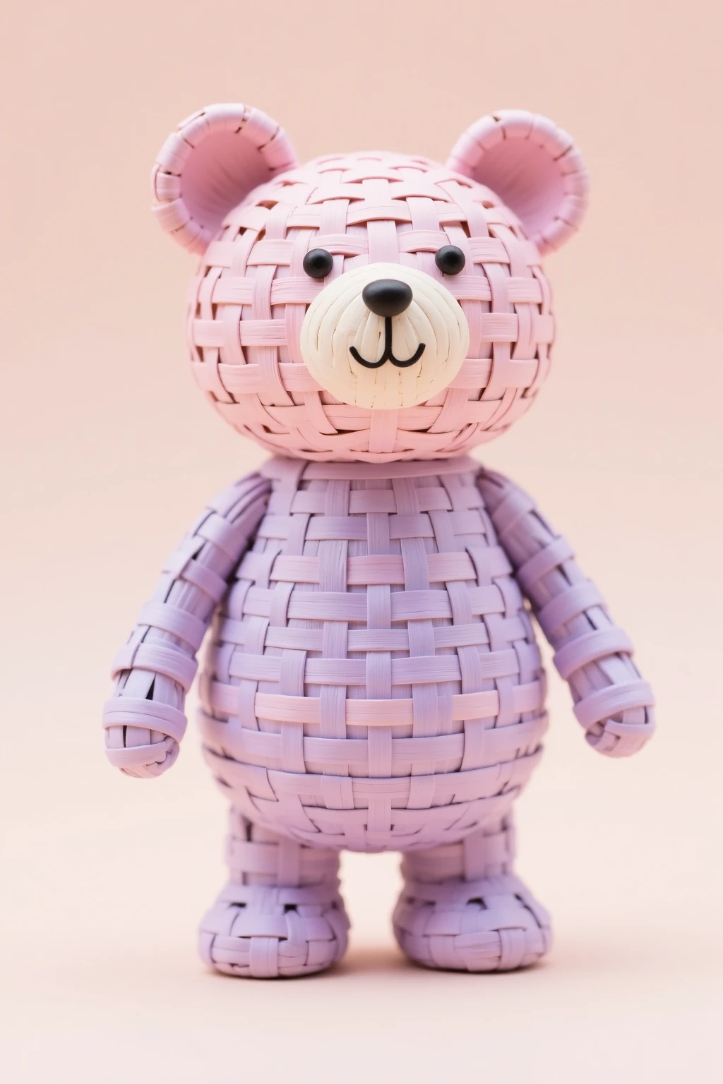 Woven texture and pastel color scheme, create a cute woven bear figurine, soft pink and lavender tones, simple and lovely, full of childlike interest.