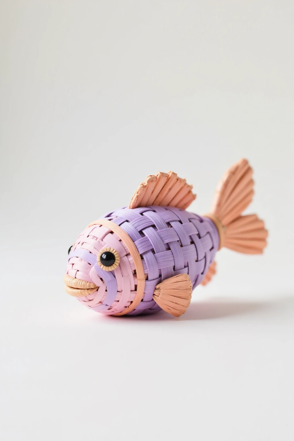Woven texture and pastel color scheme, craft a woven fish model, pastel purple and orange, lively shape, like swimming in water.