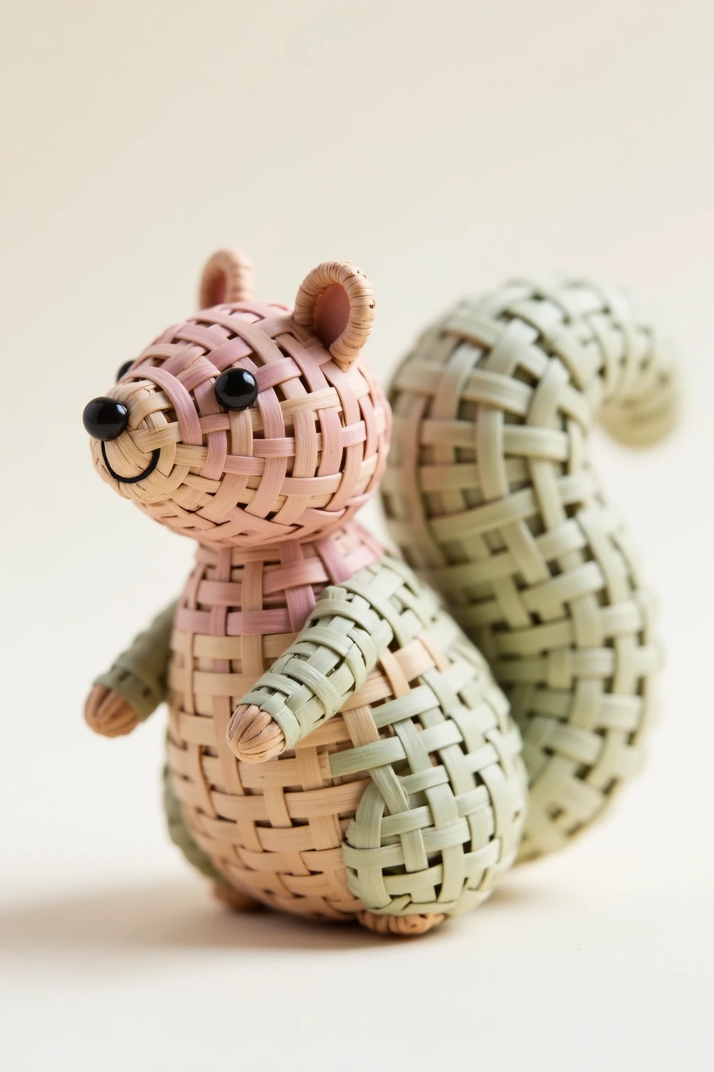 Woven texture and pastel color scheme, make a woven squirrel ornament, brown and light green, fluffy tail, very vivid.