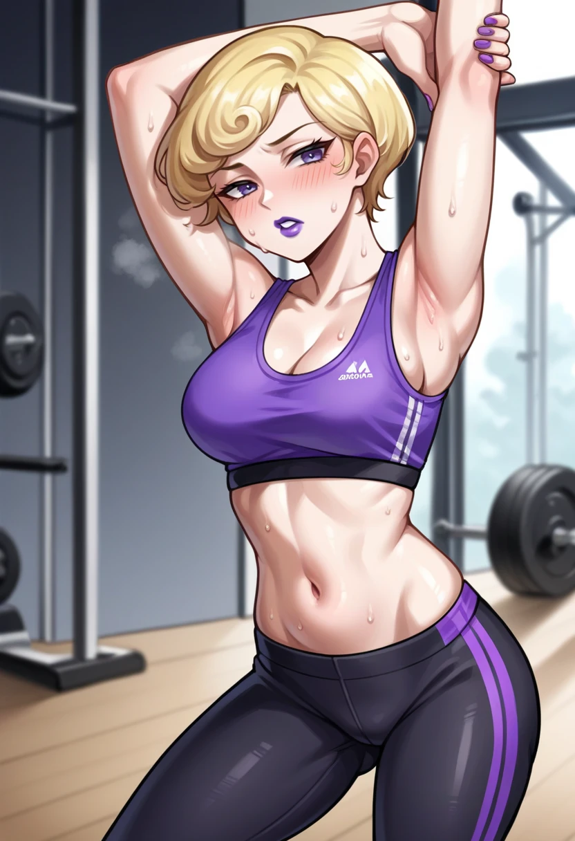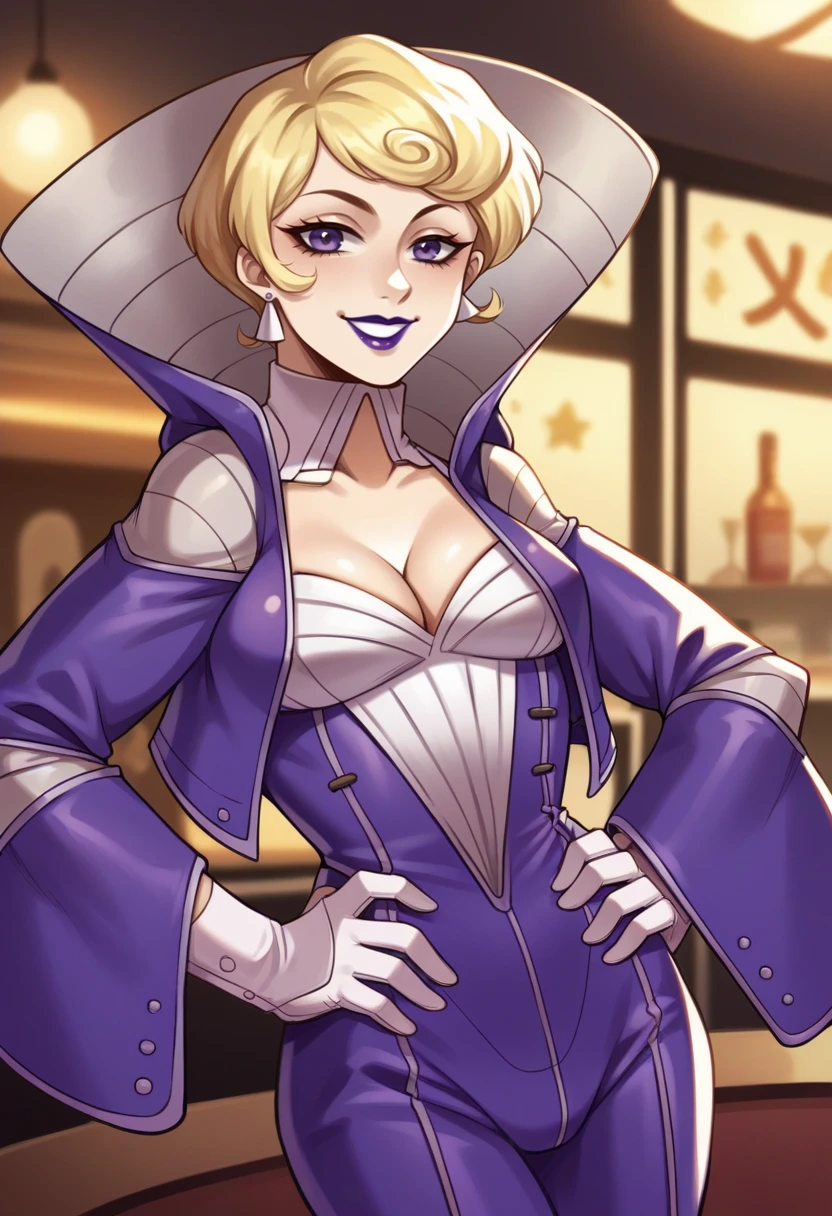 madamsmtii, blonde hair, short hair, lipstick, purple dress, bodysuit, cleavage, collar,