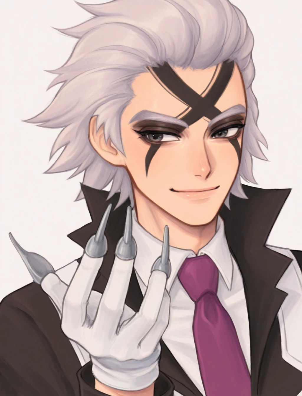 white shirt, claws, purple necktie, black jacket, white gloves, black pants