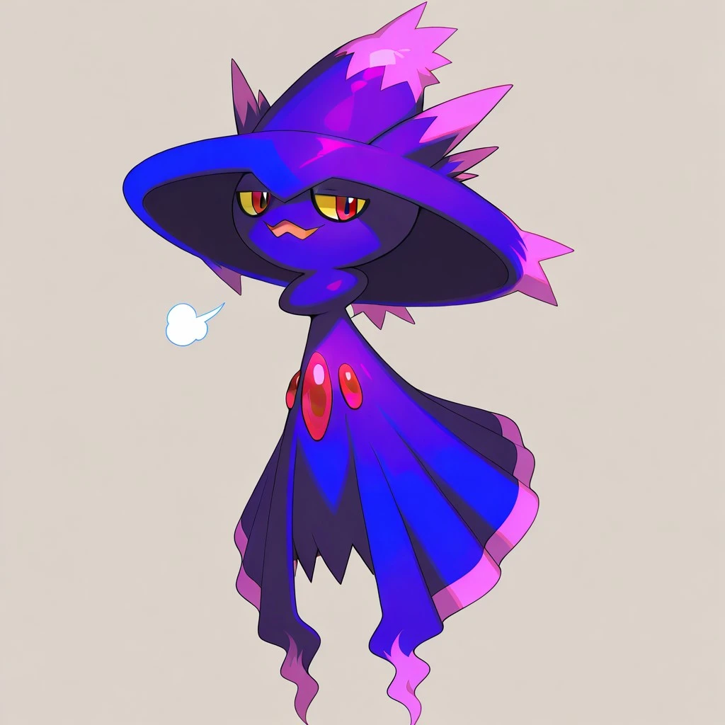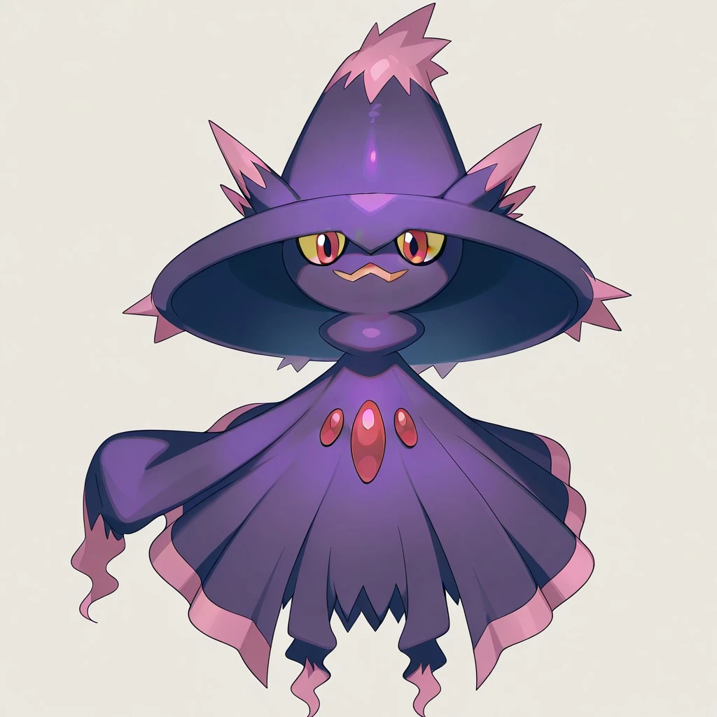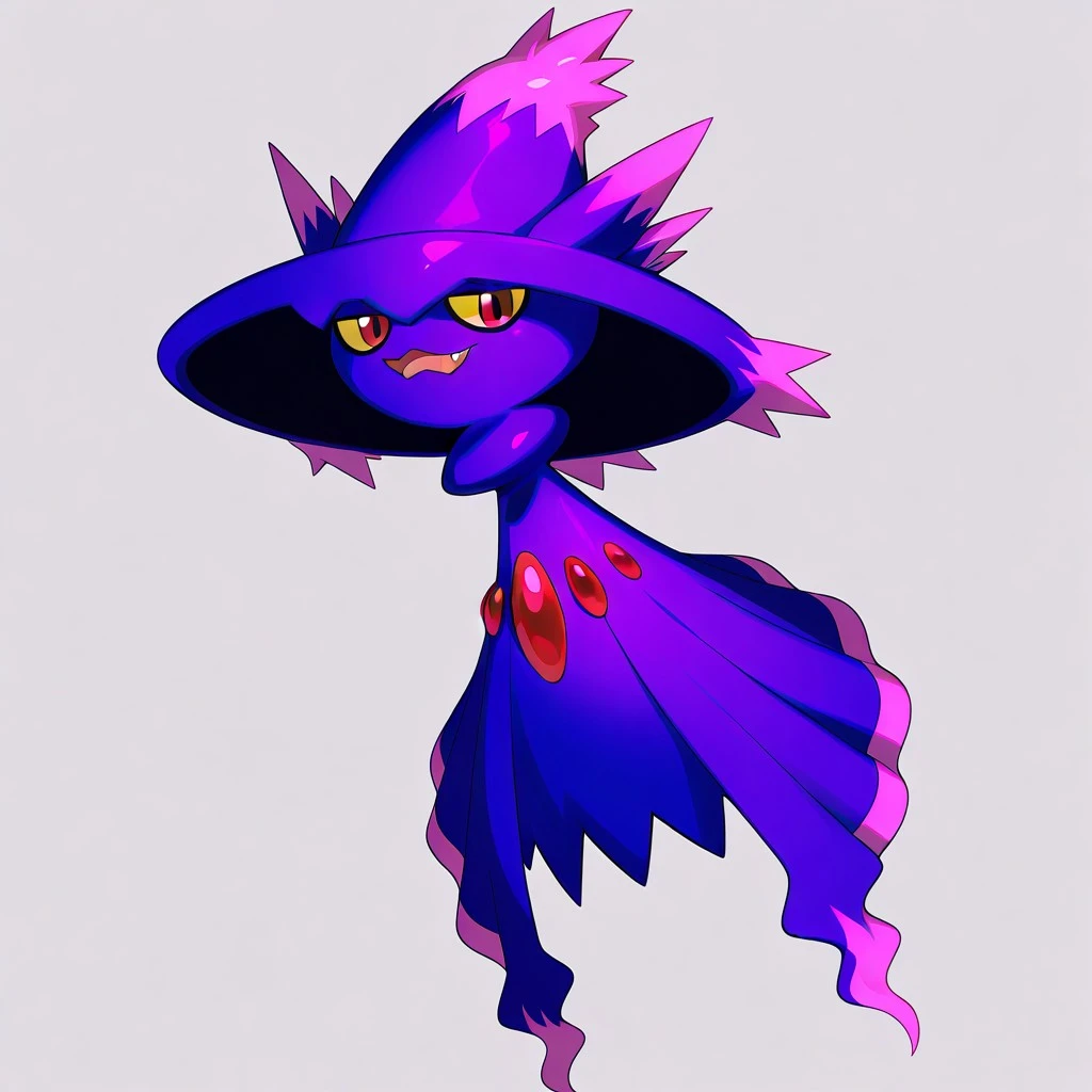 mismagius, pokemon (creature), dark purple body, witch hat, pink markings, yellow sclera, red eyes, three red gems