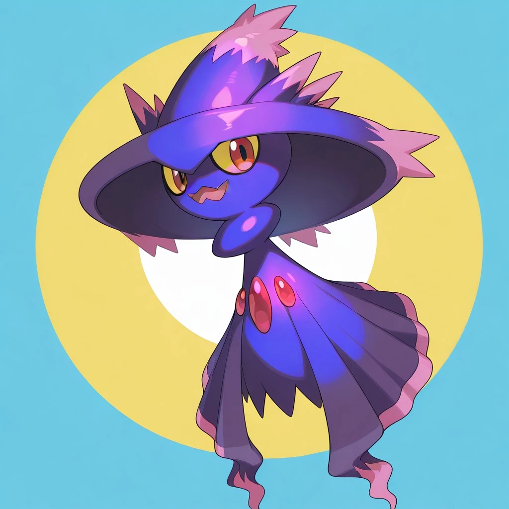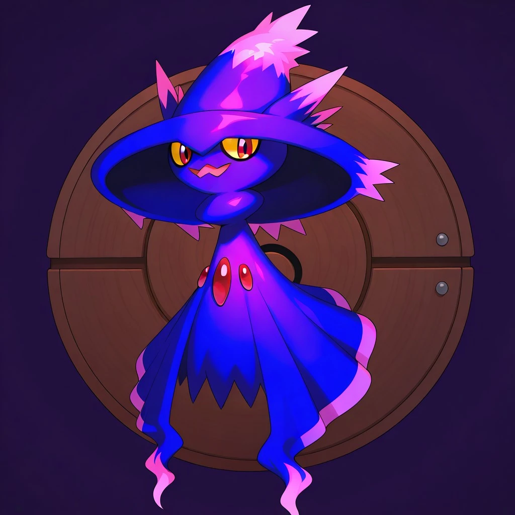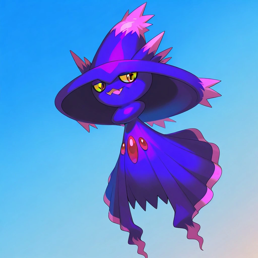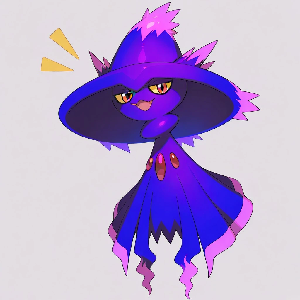 mismagius, pokemon (creature), dark purple body, witch hat, pink markings, yellow sclera, red eyes, three red gems