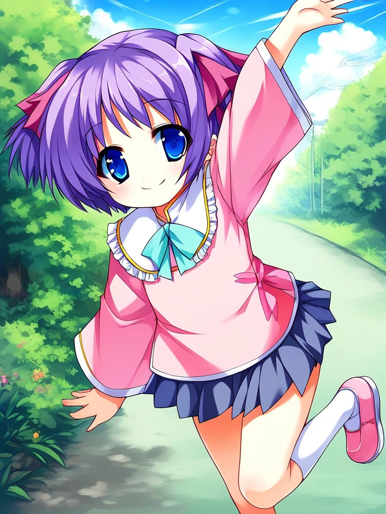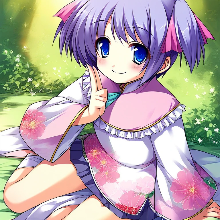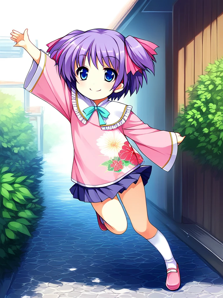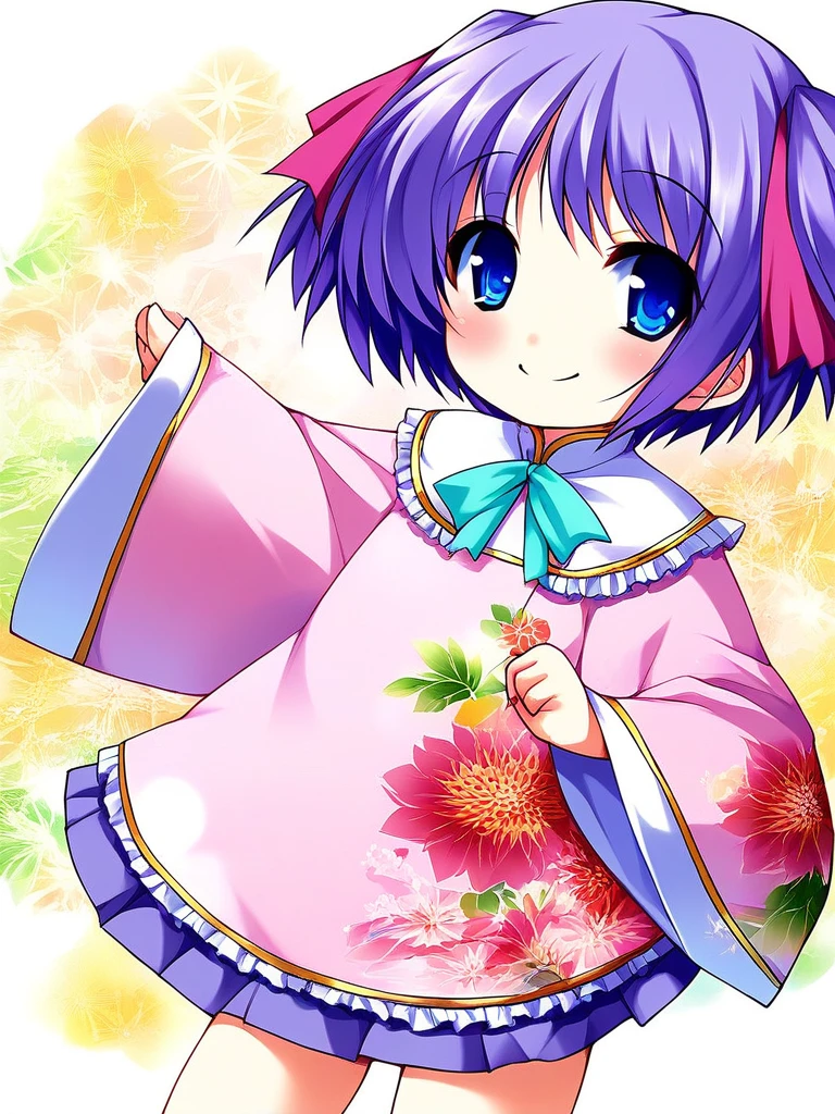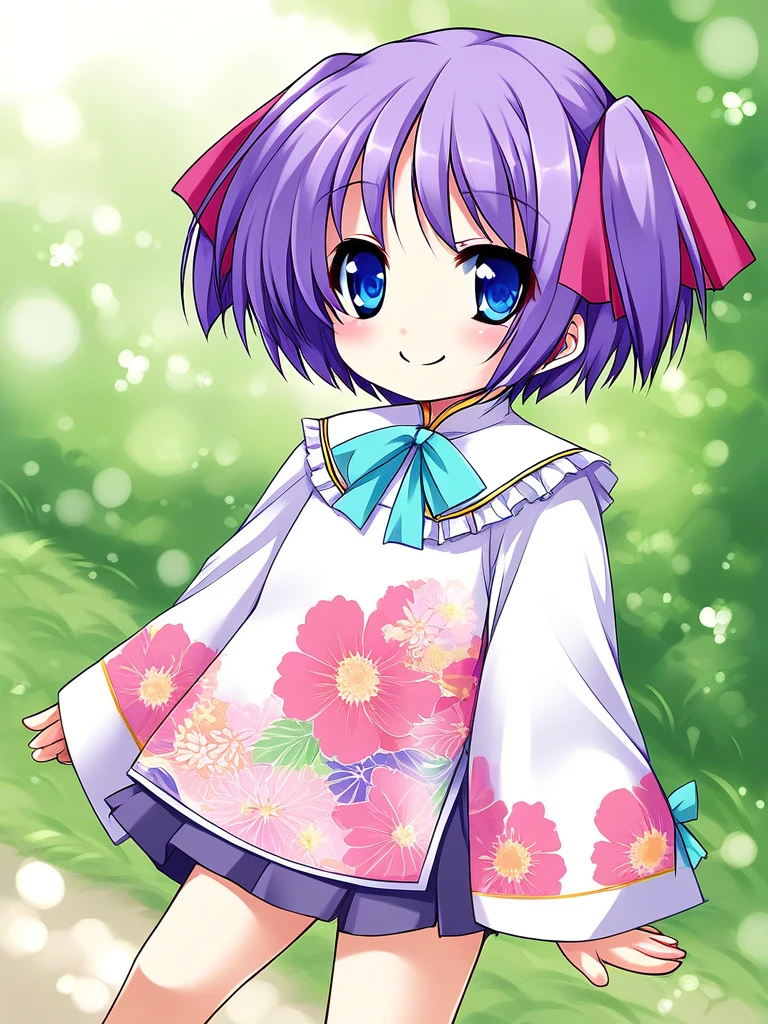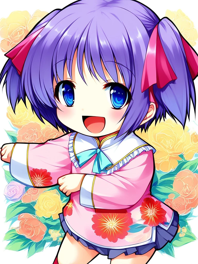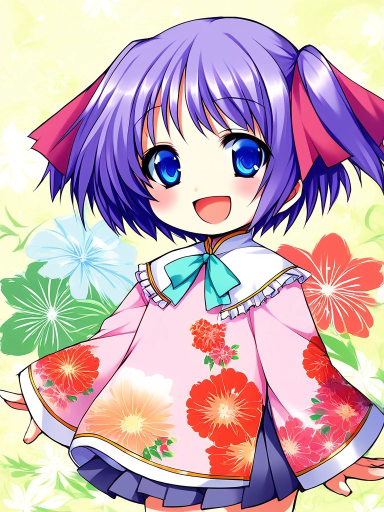 Riri_Koihime, solo, blue eyes, purple hair, short hair, twintails, hair ribbon, chibi,