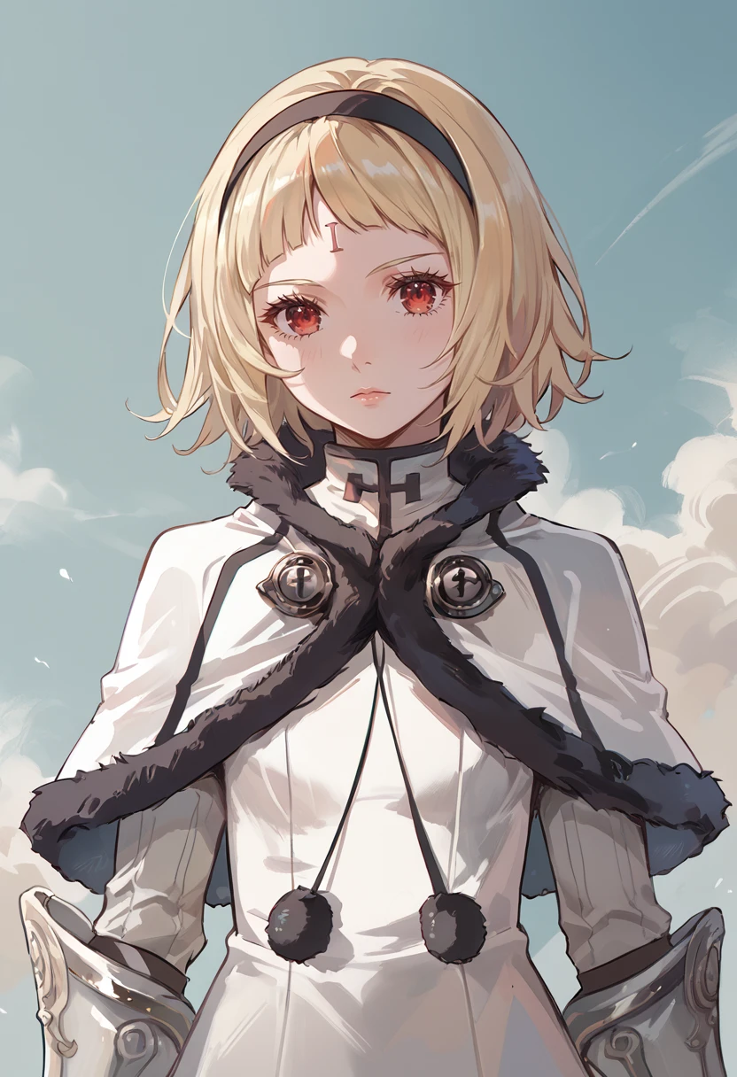 onesdxl1111, one, red eyes, blonde hair, hairband, short hair, mark on the forehead, roman numeralClothes promt: