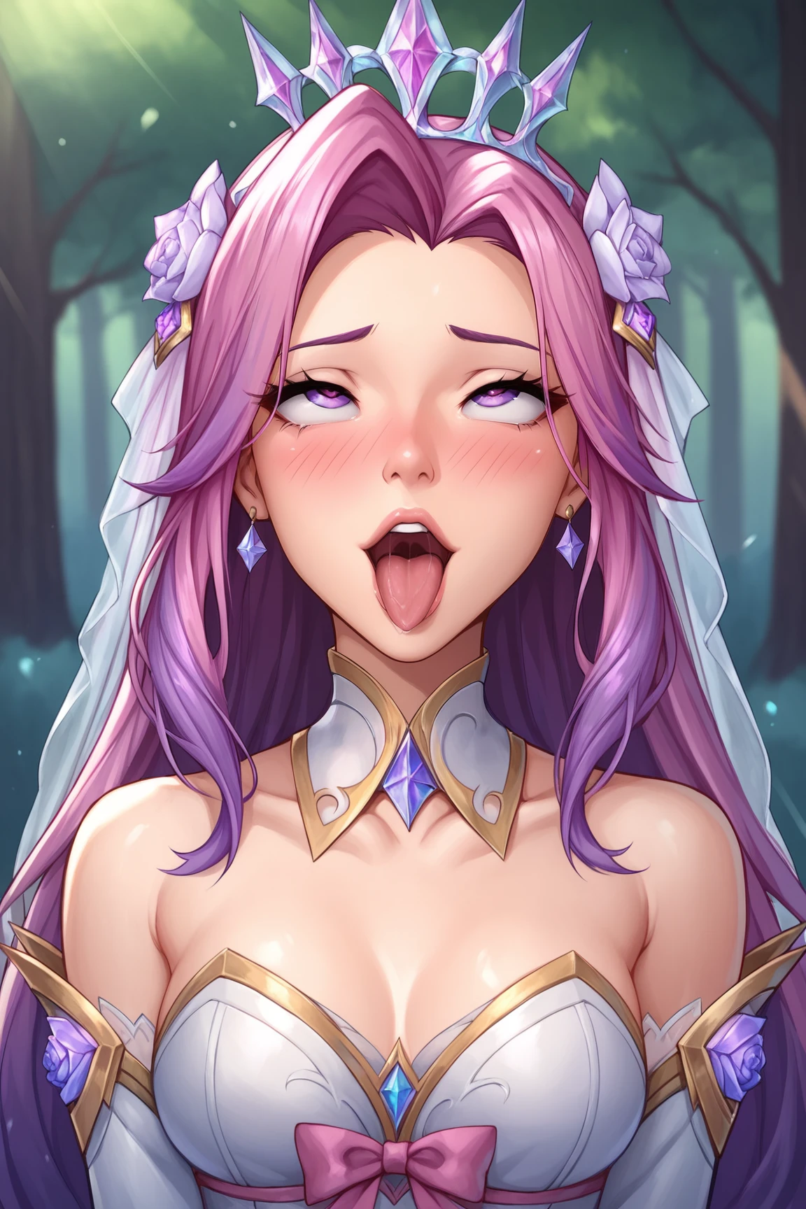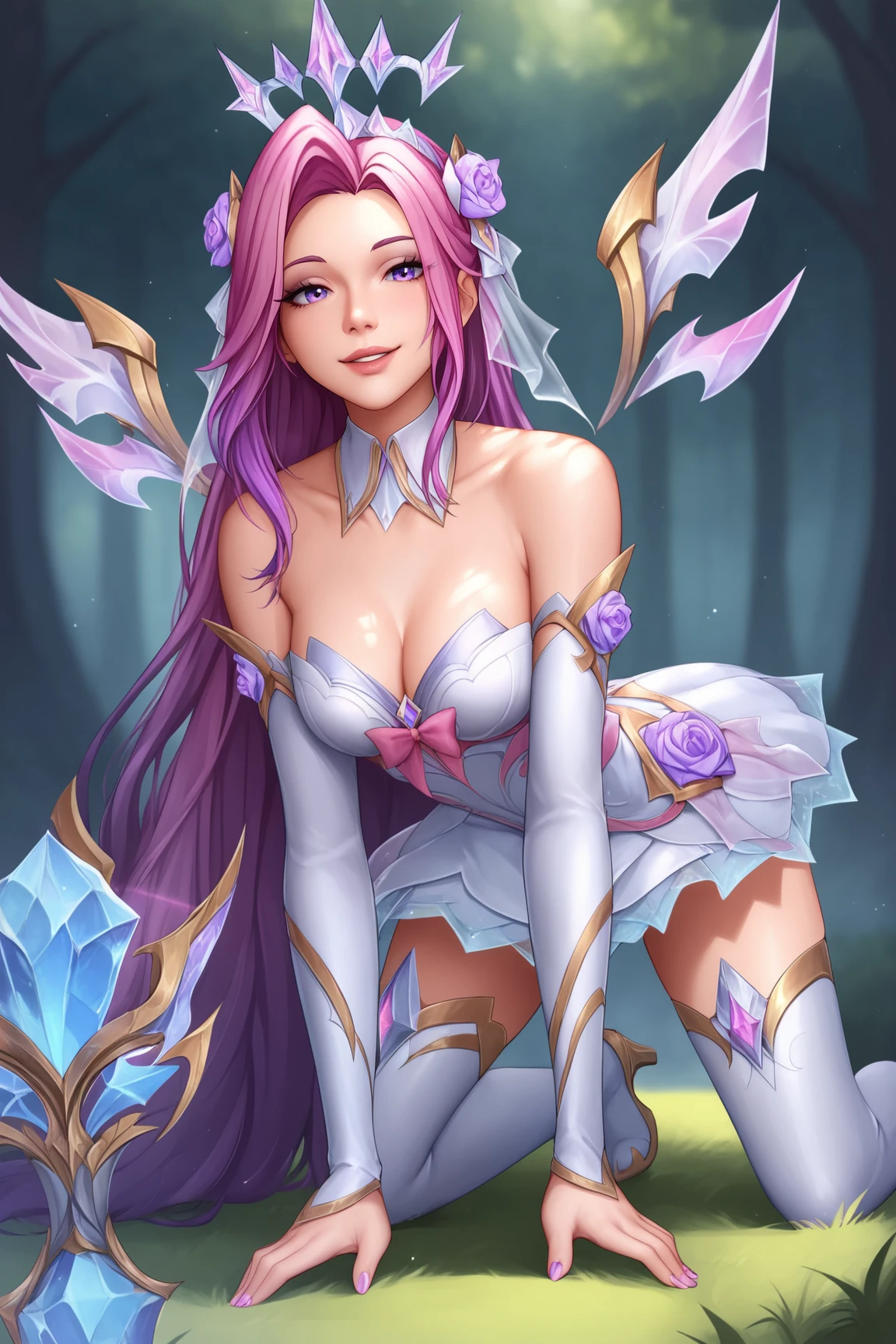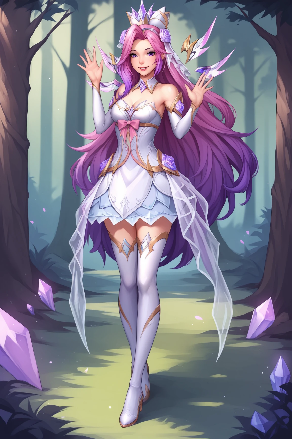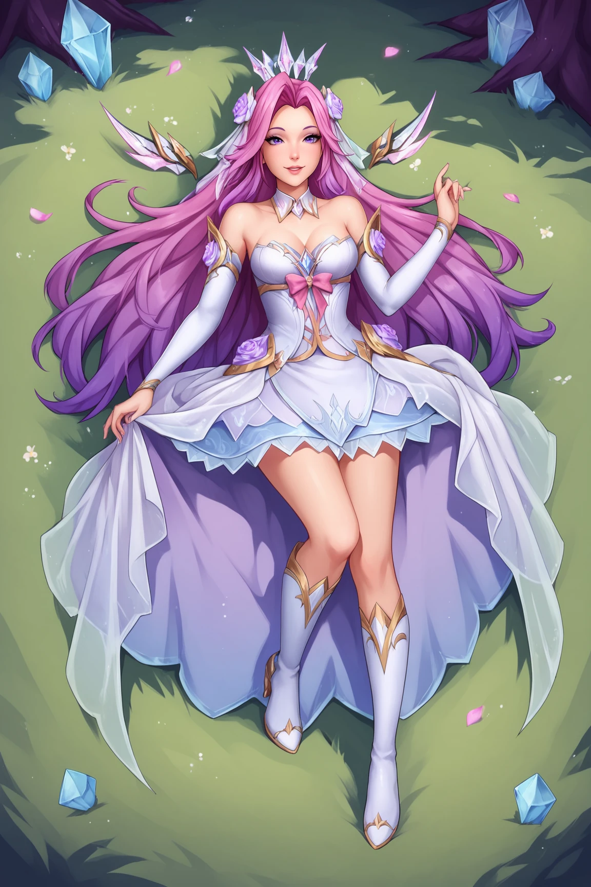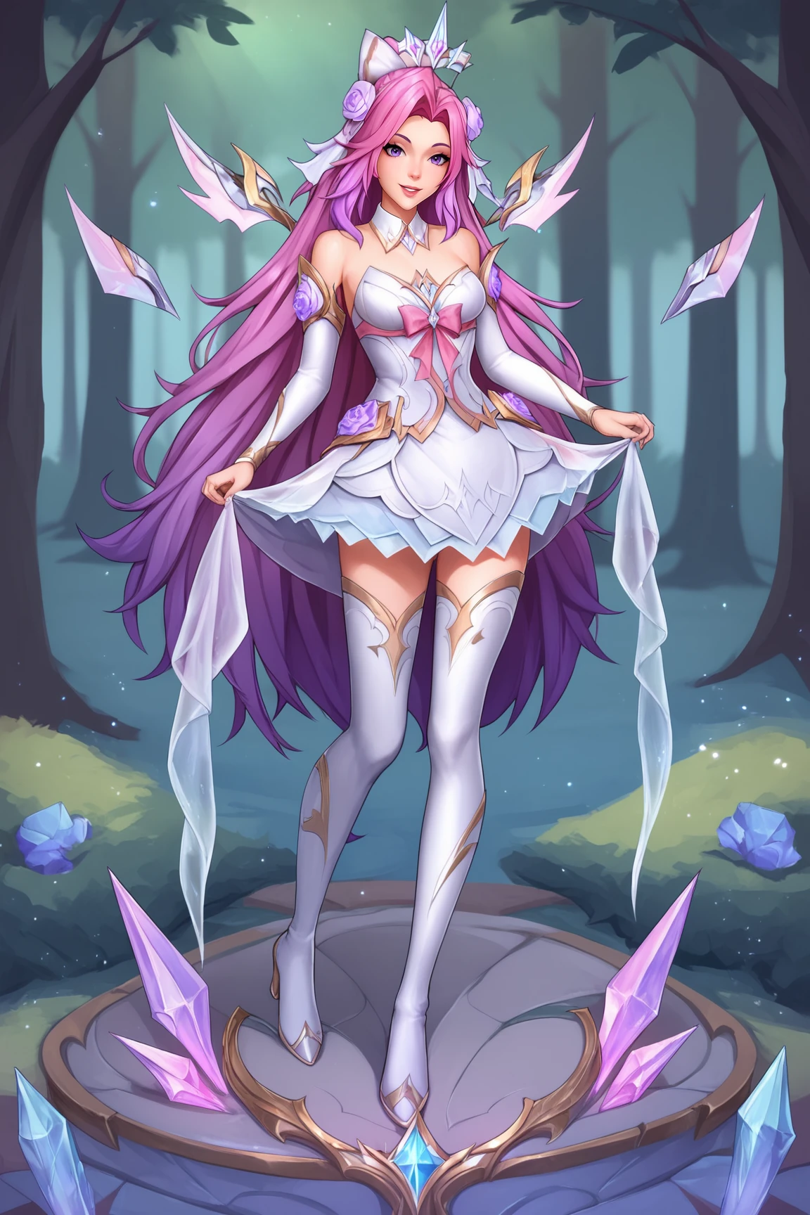 SeraphineCRLoLXL, purple eyes, pink hair, purple hair, multicolored hair, long hair, parted bangs, hair flower, hair ornament, crystal crown, medium breasts, detached collar, bare shoulders, white dress, dress ornament, pink bow, detached slevees, white skirt, white thigh boots, high hells