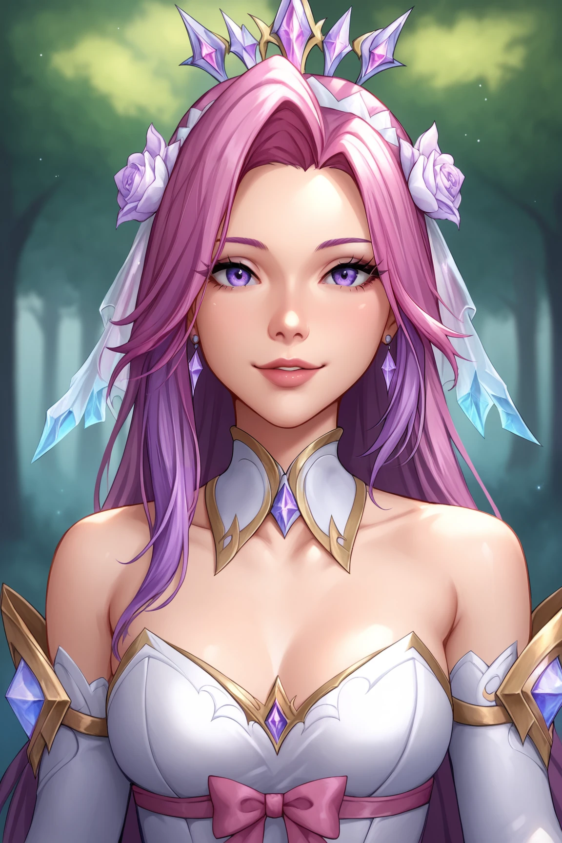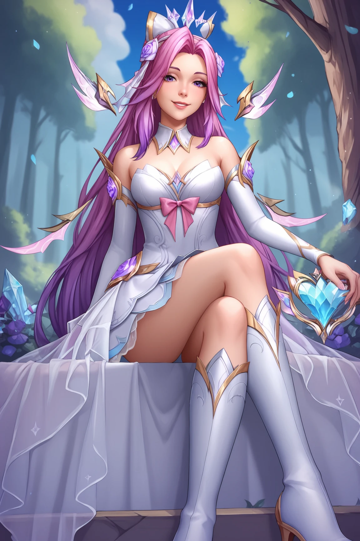 ➜ SeraphineCRLoLXL, purple eyes, pink hair, purple hair, multicolored hair, long hair, parted bangs, hair flower, hair ornament, crystal crown, medium breasts, detached collar, bare shoulders, white dress, dress ornament, pink bow, detached slevees, white skirt, white thigh boots, high hells