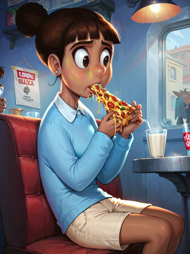 If you want her typical outfit it's blue collared shirt, long sleeves then give her shorts or leggings, whatever you like.