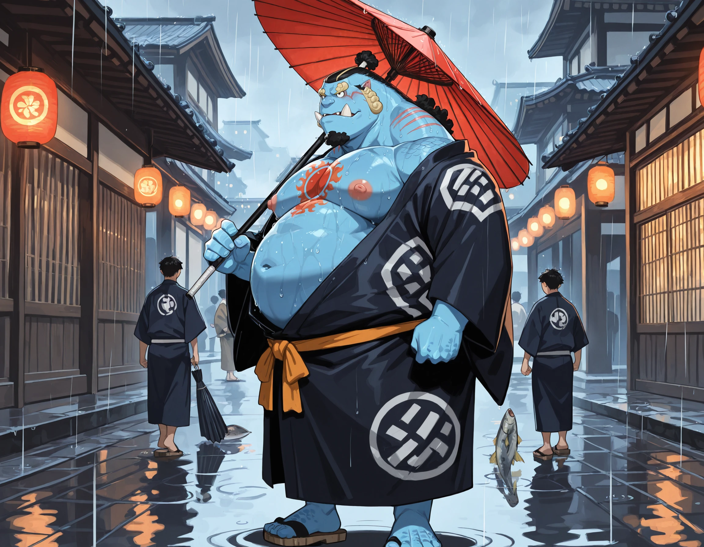 Use: Jinbei, fish boy, colored skin, belly, teeth, fangs, red sun tattoo, black hair