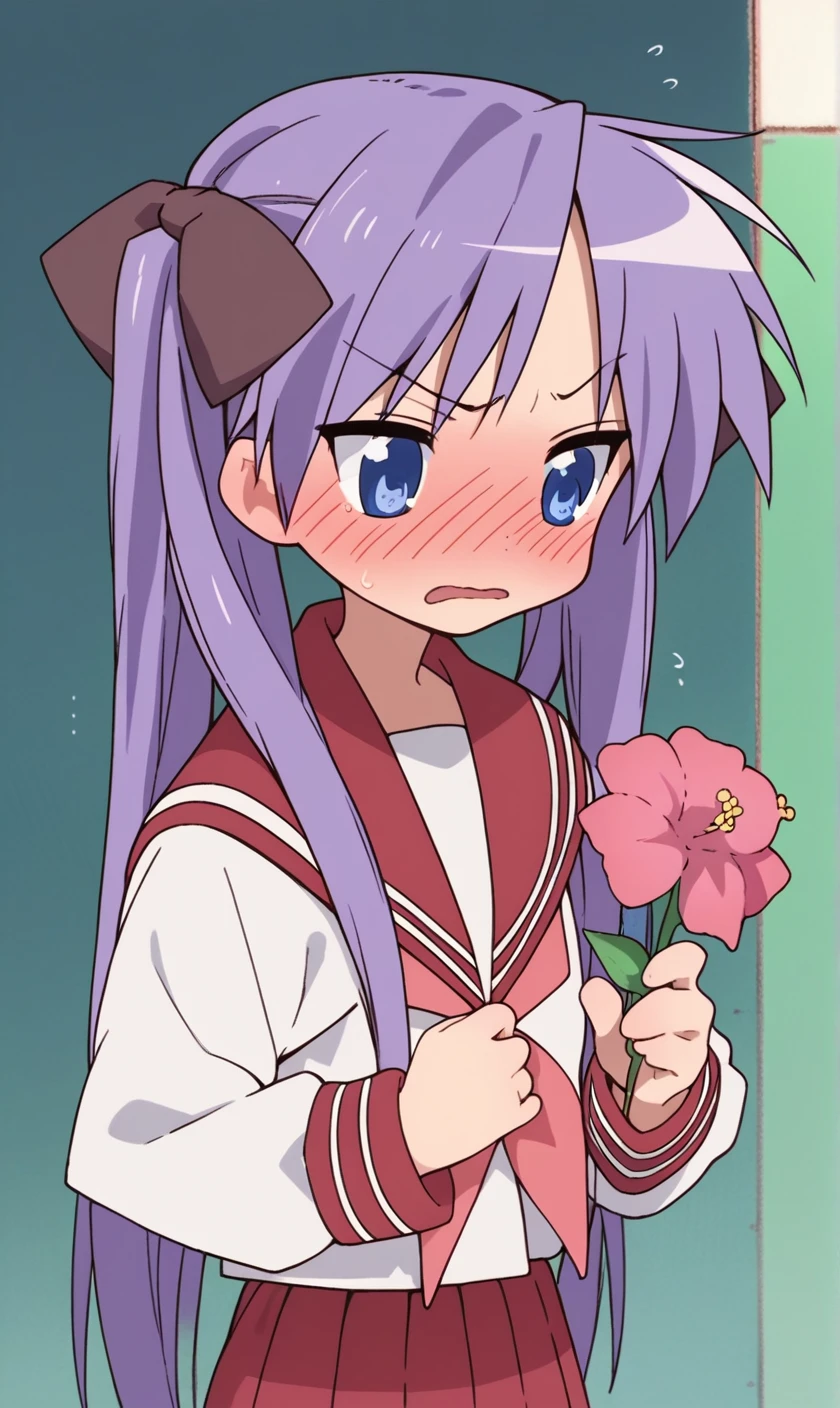 Kagami Hiiragi, 1girl, solo, twintails, hair ribbon, blue eyes, serafuku, red skirt, red sailor collar, shoes, white tighhighs