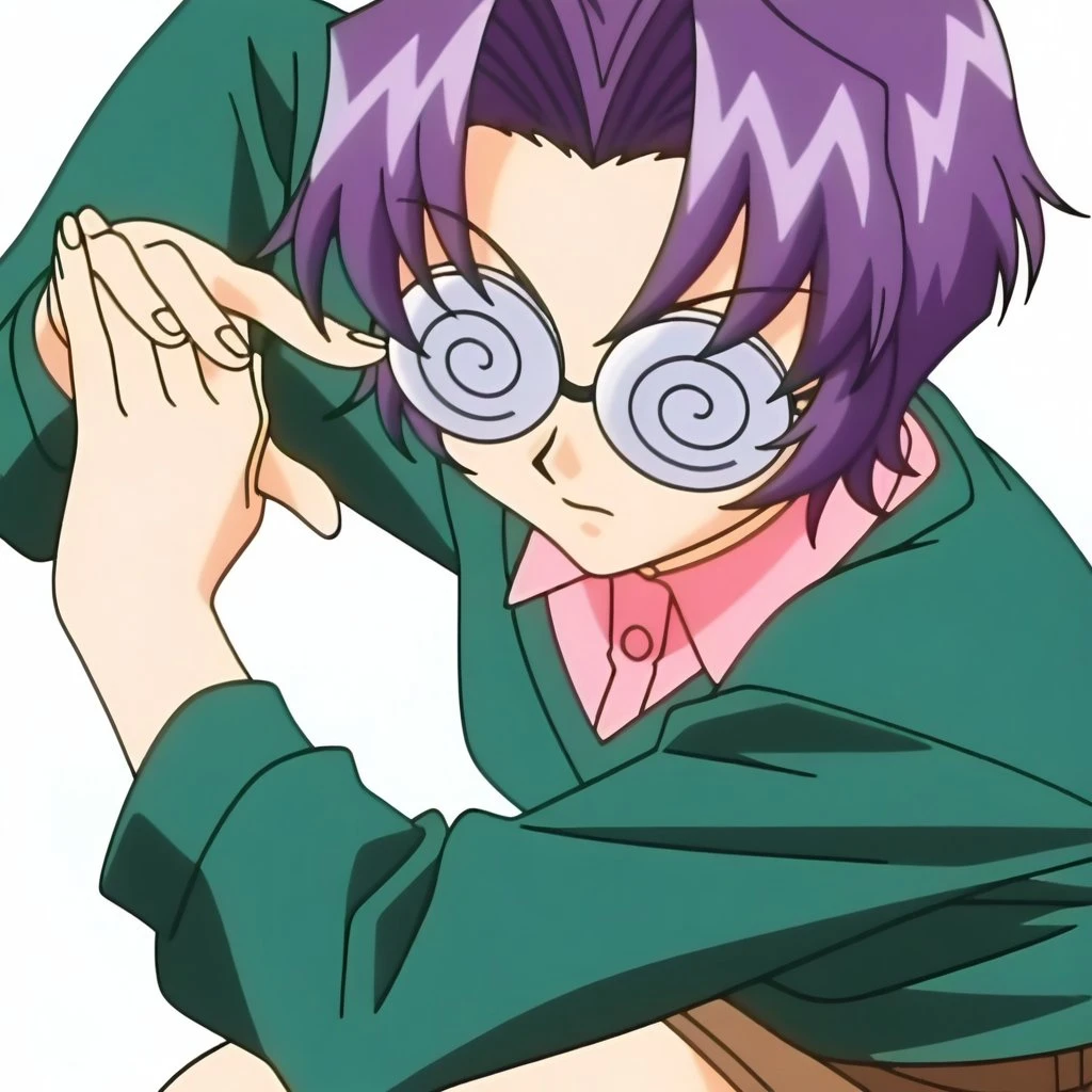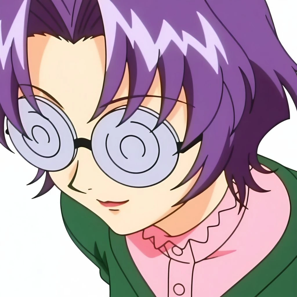 Miyama (in college): sdxl-akiba-miyama, purple hair, short hair, glasses, parted bangs, hair intakes, collard shirt, coke-bottle glasses, pink shirt, green sweater, grey pants, brown shoes