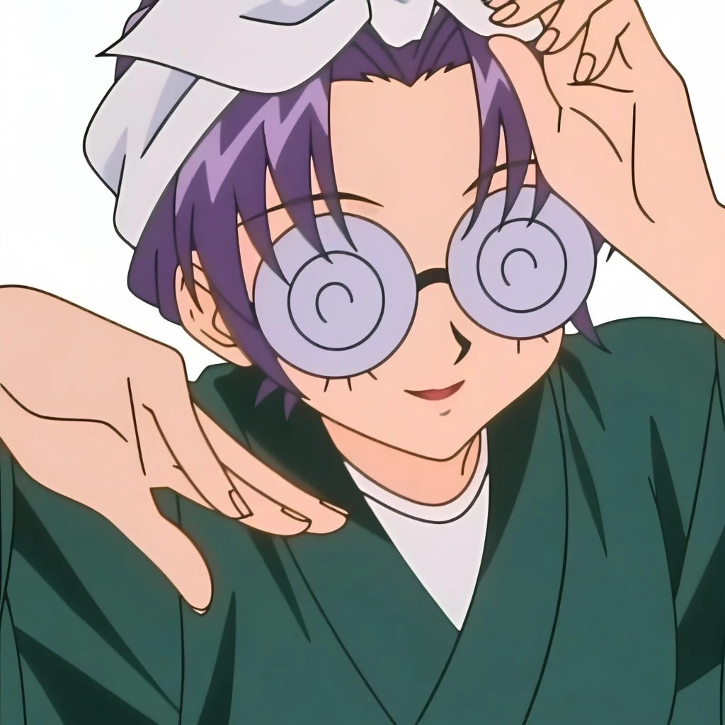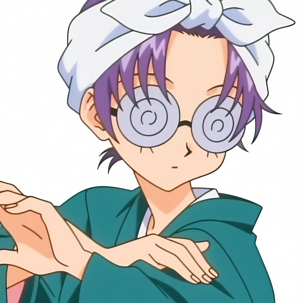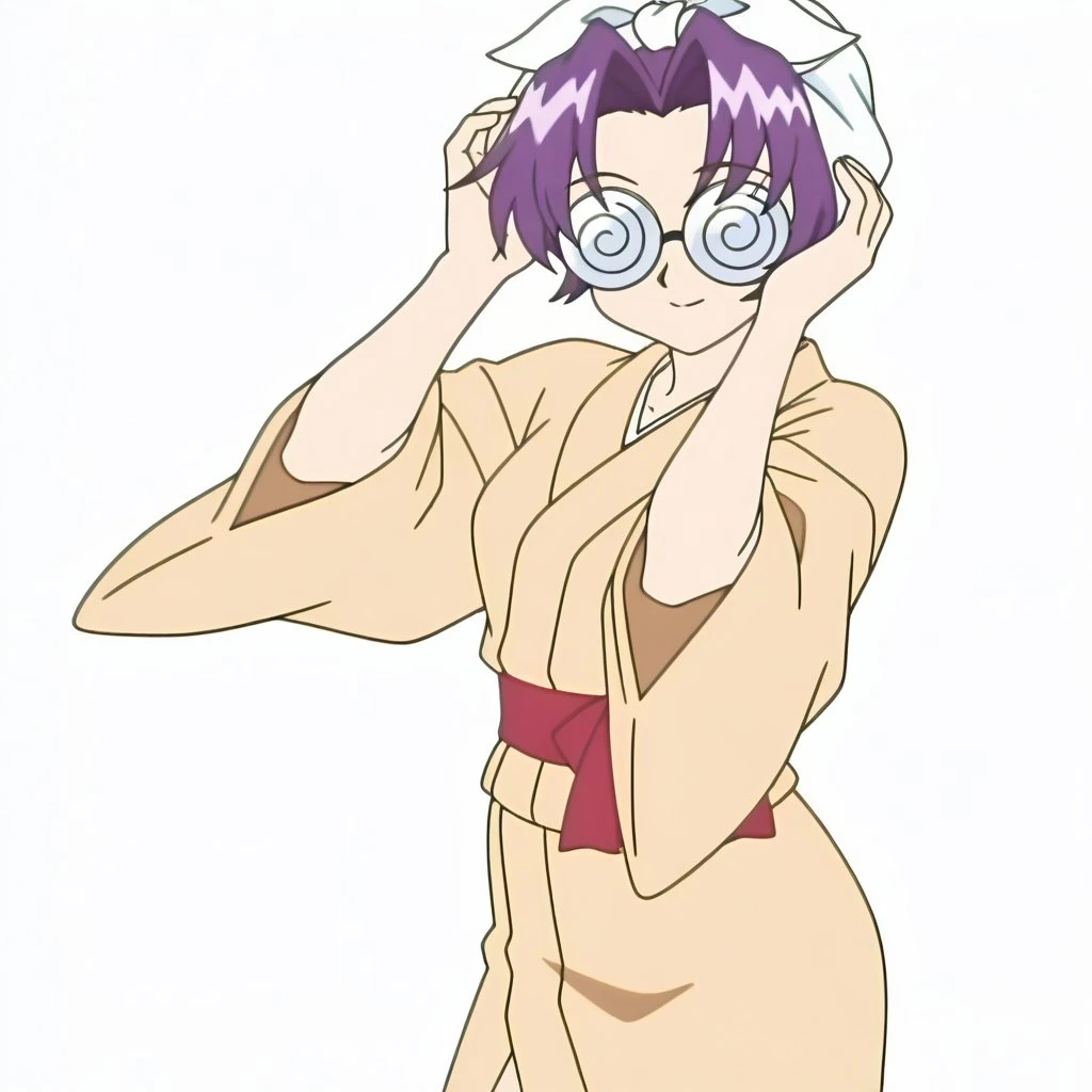 Miyama (at onsen): sdxl-akiba-miyama-onsen, purple hair, short hair, glasses, parted bangs, towel on head, japanese clothes, brown yukata, kimono, white shirt, coke-bottle glasses
